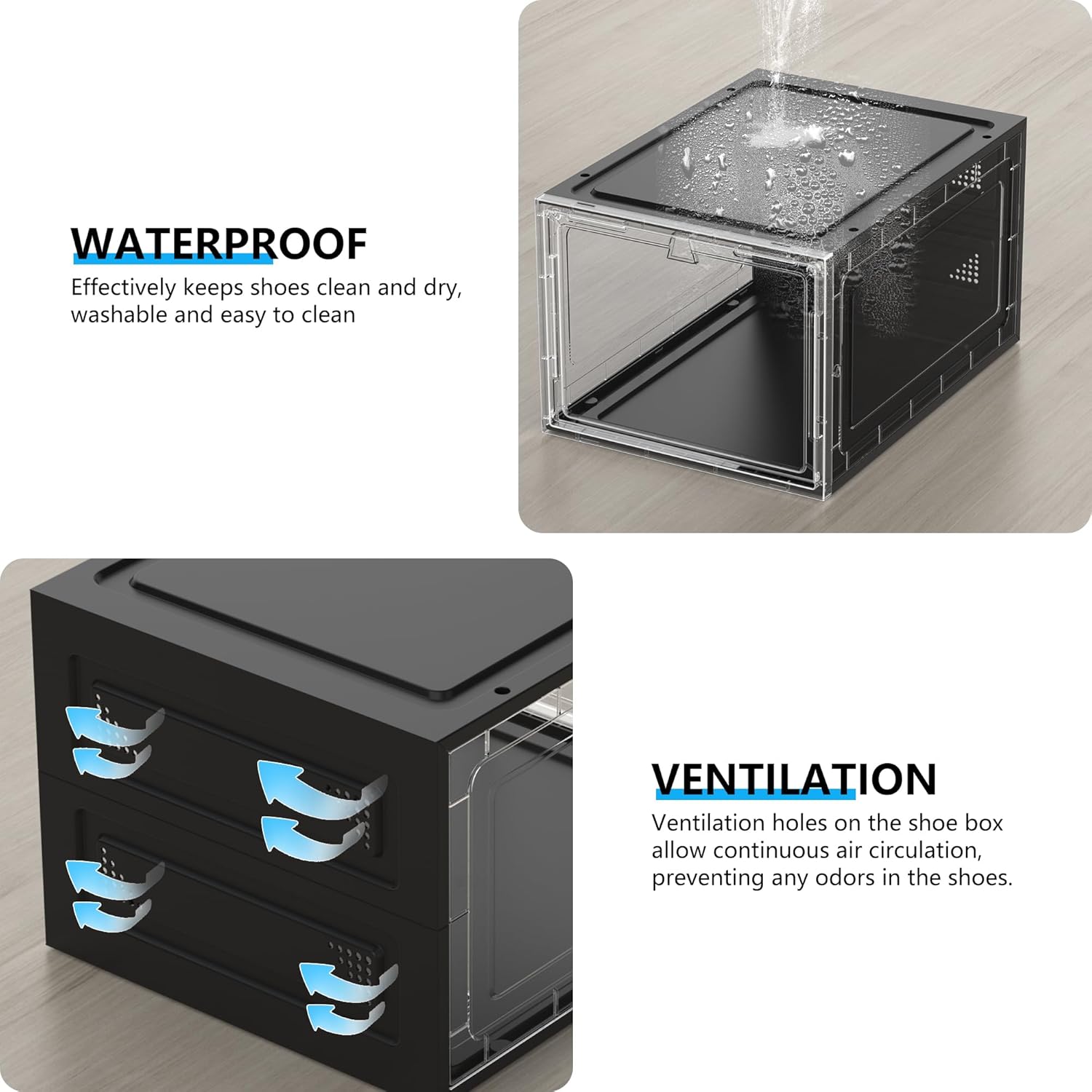 • Upgraded Hard Shoe Boxes:Say goodbye to soft plastic shoe boxes! Made of from sturdy hard plastic on all six sides, our shoe boxes boast exceptional durability and load-bearing capacity. Additionally, their transparent design ensures easy viewing of your shoes.
