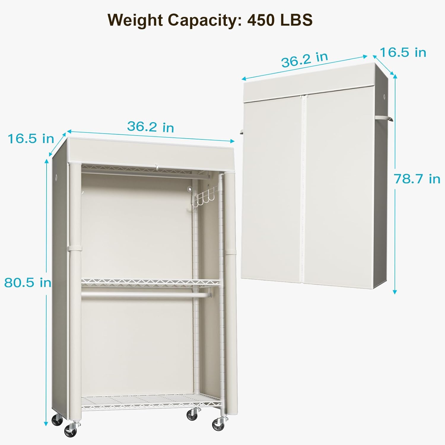 • Overall Dimension: The covered clothes rack whole size is 36.2"W x 16.5"D x 80.5"H, which combines with 3 wire shelves and 2 hanger rods for loading 450 lbs