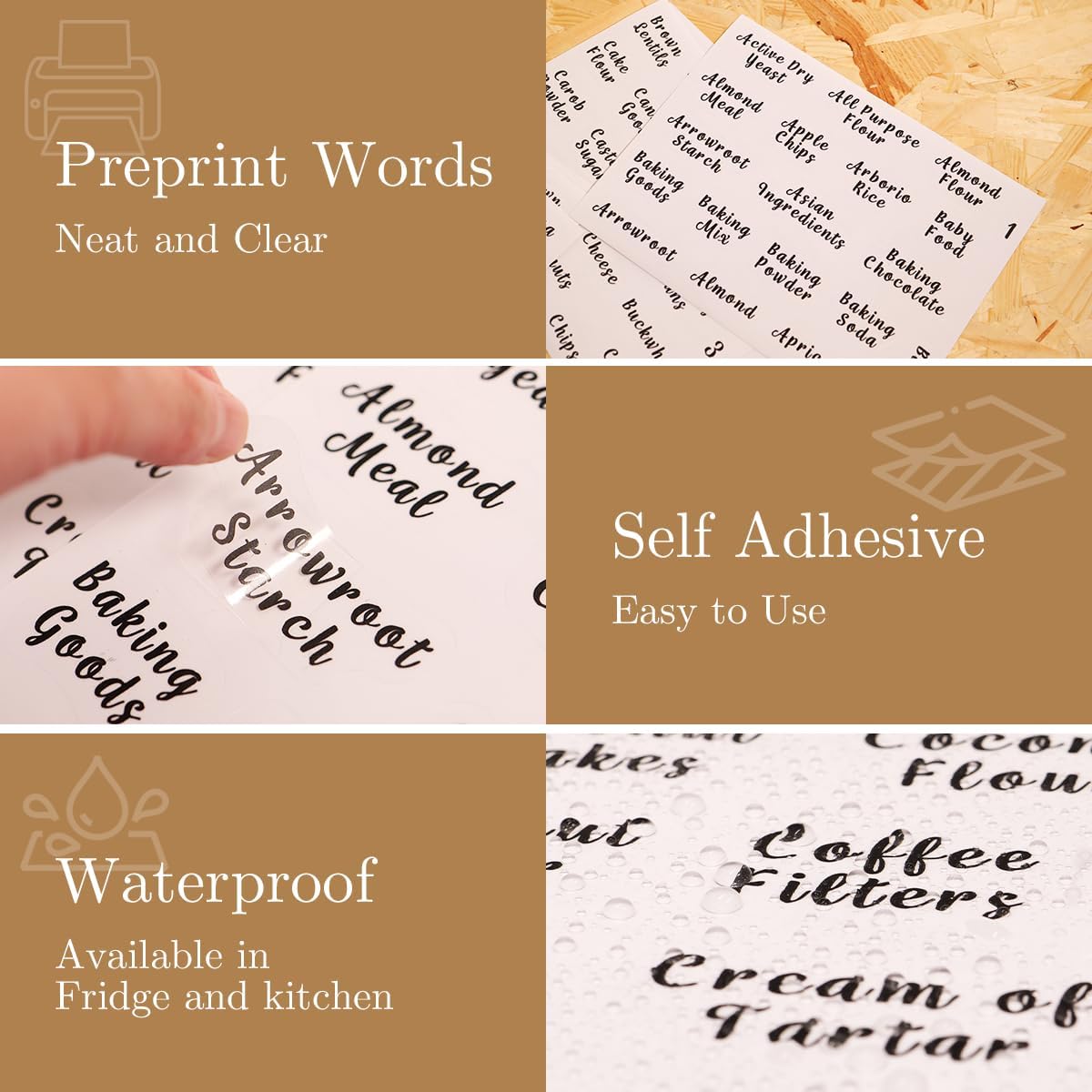 • 【PERFECT FOOD LABELS INCLUDED】248 Kitchen pantry labels for pantry storage containers to keep your food fresh and pantry tidy. Minimalist labels are black text on transparent food labels stickers suitable for all glass jar with lids airtight. Pantry decal organization labels are preprinted on premium waterproof vinyl stickers that won't tear or peel off but can easily be removed.