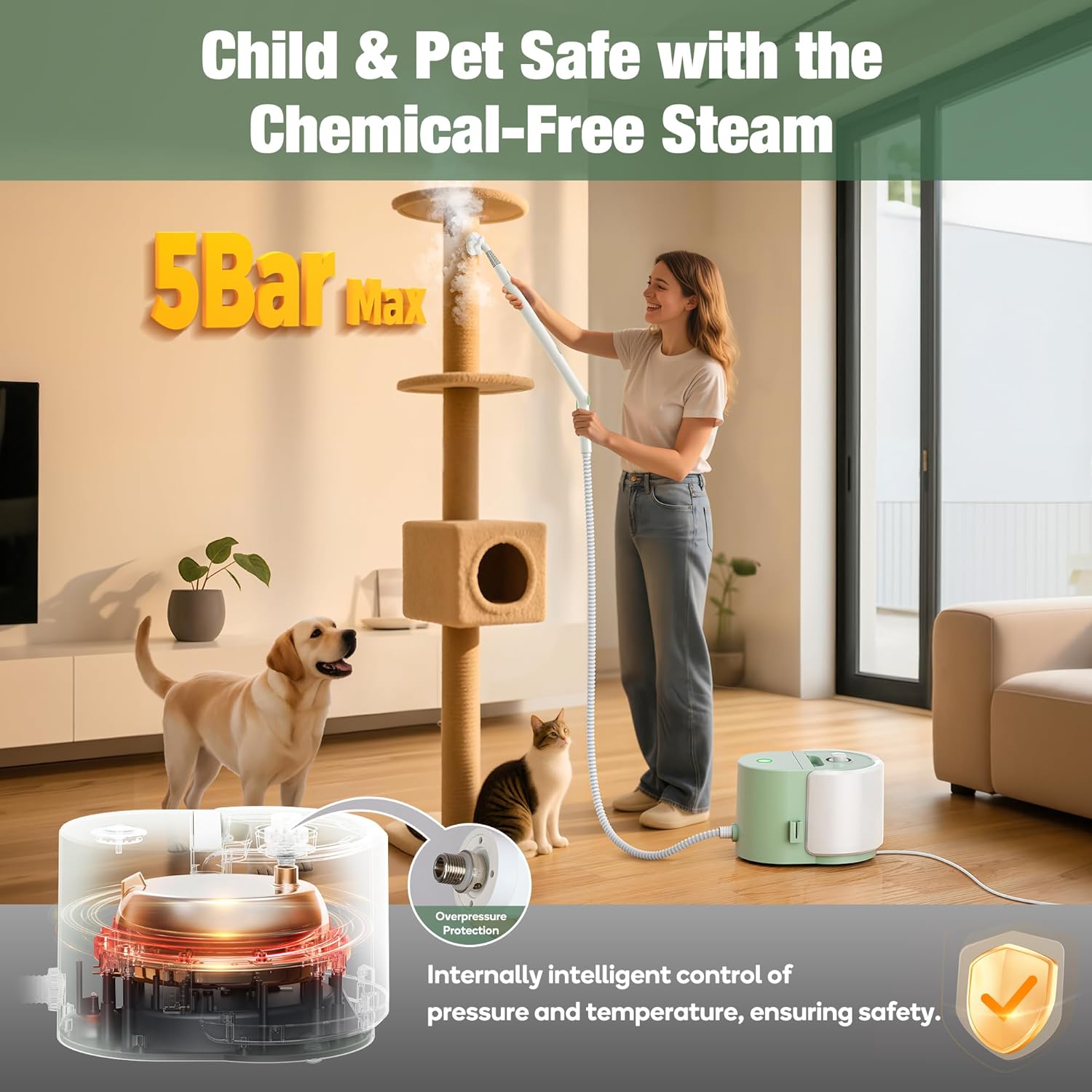 • [Multi-Layer Safety Mechanism]​​ Engineered with pressure and temperature controls, this system ensures stable, consistent operation. With an advanced safety valve, overpressure protection enhances safety by preventing pressure buildup—while steam-only cleaning keeps it friendly to kids and pets and kills bacteria without harsh chemicals. NOTE: Designed for 110~125-volt outlets only.