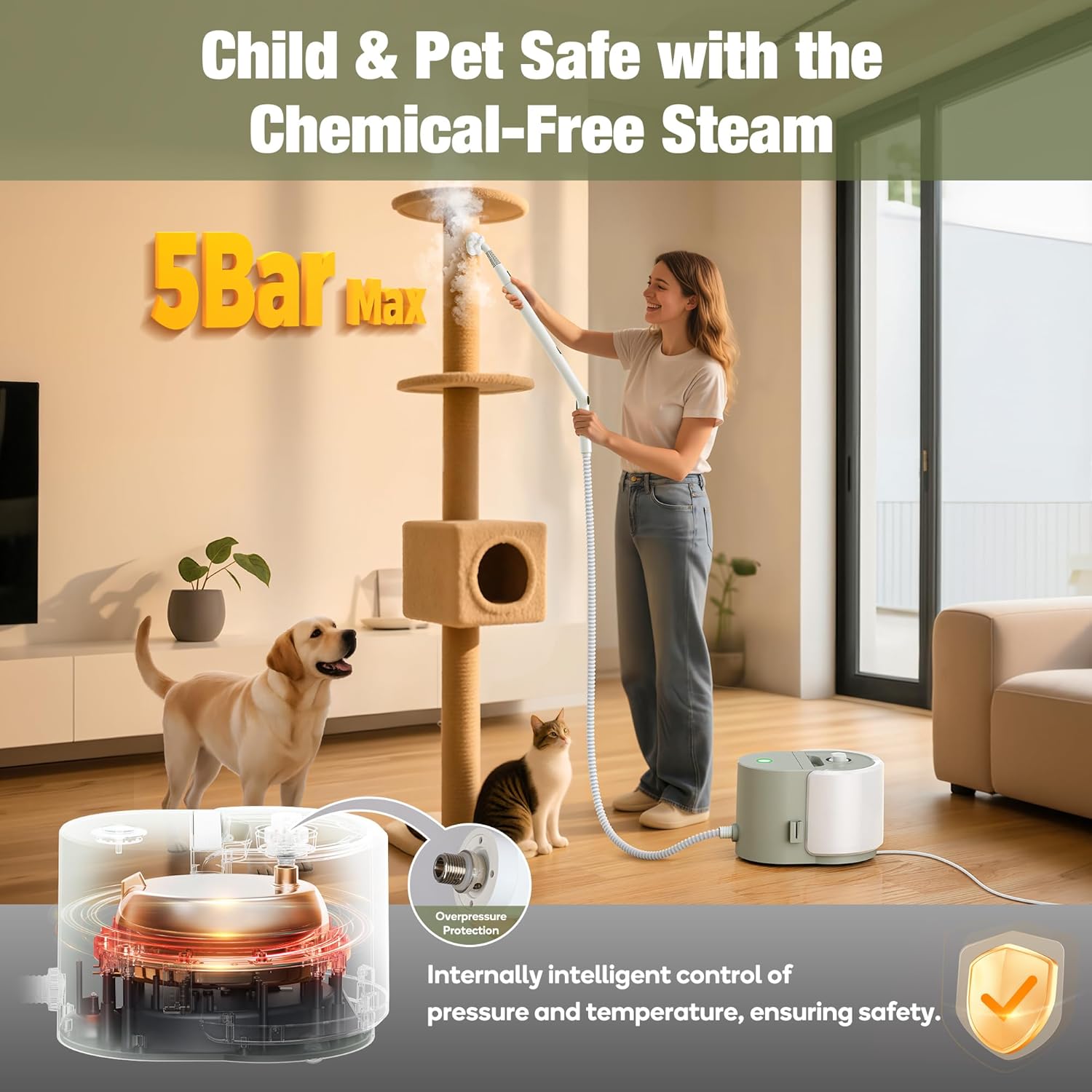 • ​[Multi-Layer Safety Mechanism] Engineered with pressure and temperature controls, this system ensures stable, consistent operation. With an advanced safety valve, overpressure protection enhances safety by preventing pressure buildup—while steam-only cleaning keeps it friendly to kids and pets. NOTE: Designed for 110~125-volt outlets only.