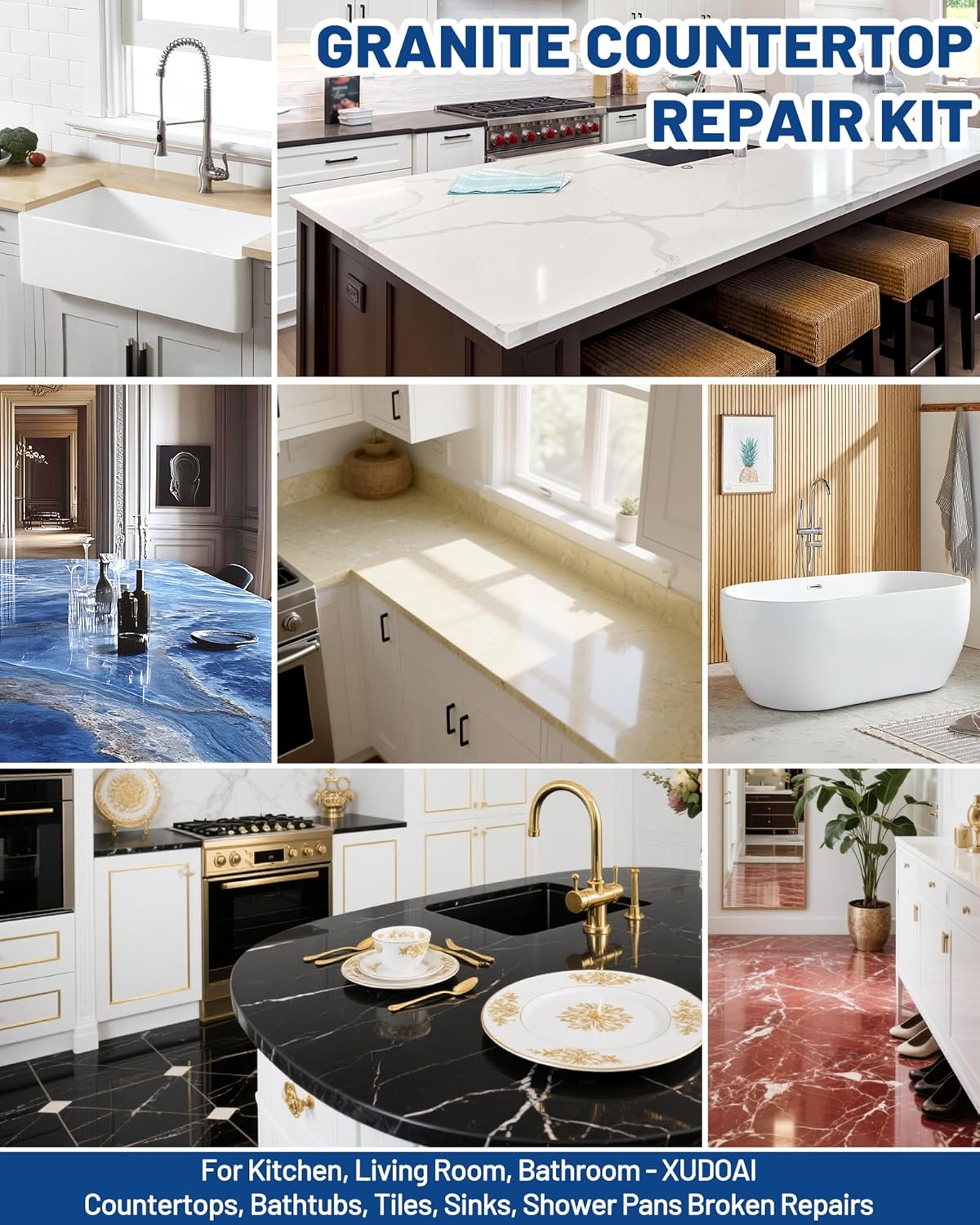 • Tile and Granite Repair Kit Easy to Use: The tools needed for countertop breakage repair are included in the countertop crack repair kit, detailed instructions are provided so that even beginners can easily repair and color match, diy repair. You can restore the flatness and shine of your countertops at home