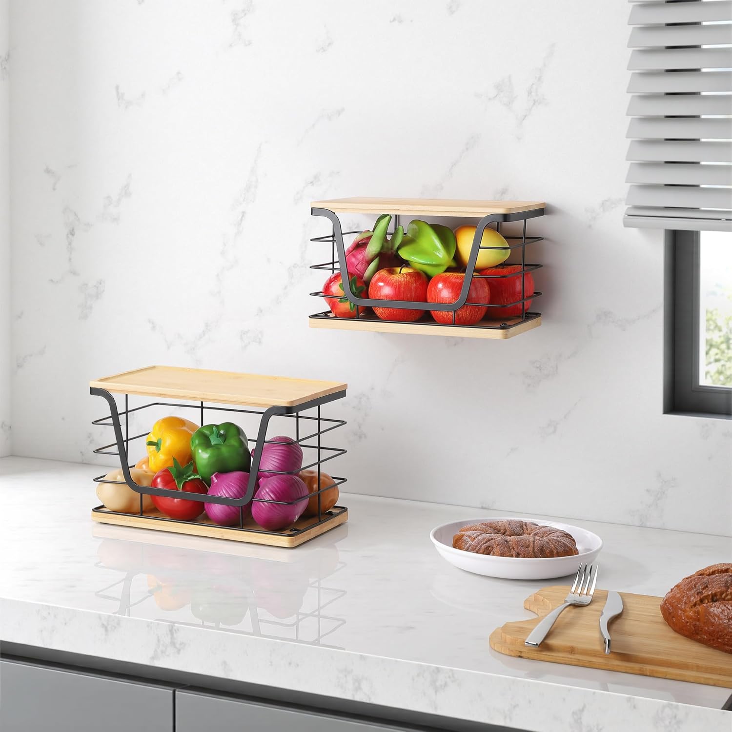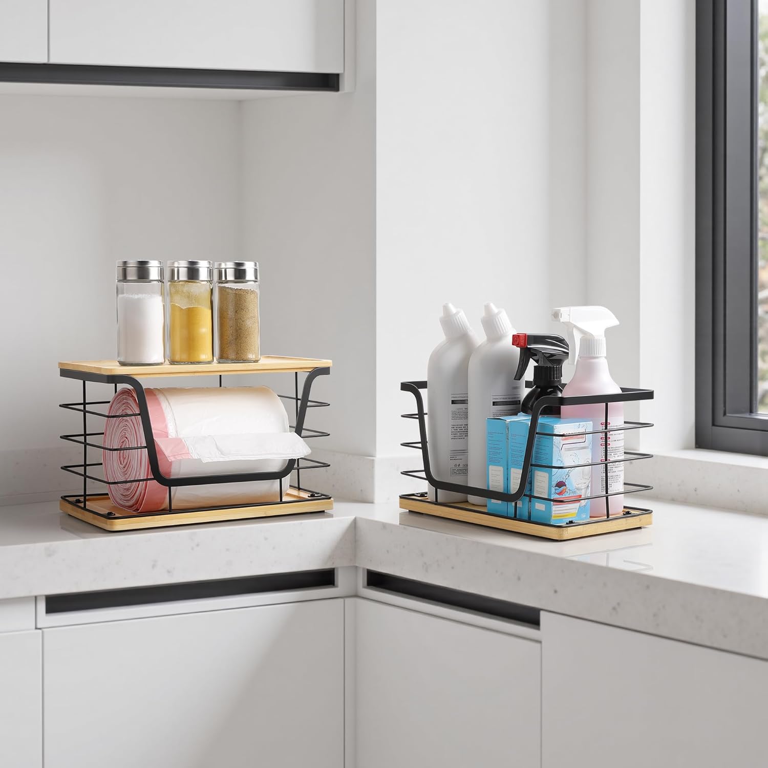 ALOCEO 2 Pack Large Garbage Bag Dispenser for 13/30/33 Gallon Bags, Potato and Onion Storage Baskets with Bamboo Lid, Stainless Steel Stackable Storage Bins for Kitchen Laundry Pantry Room