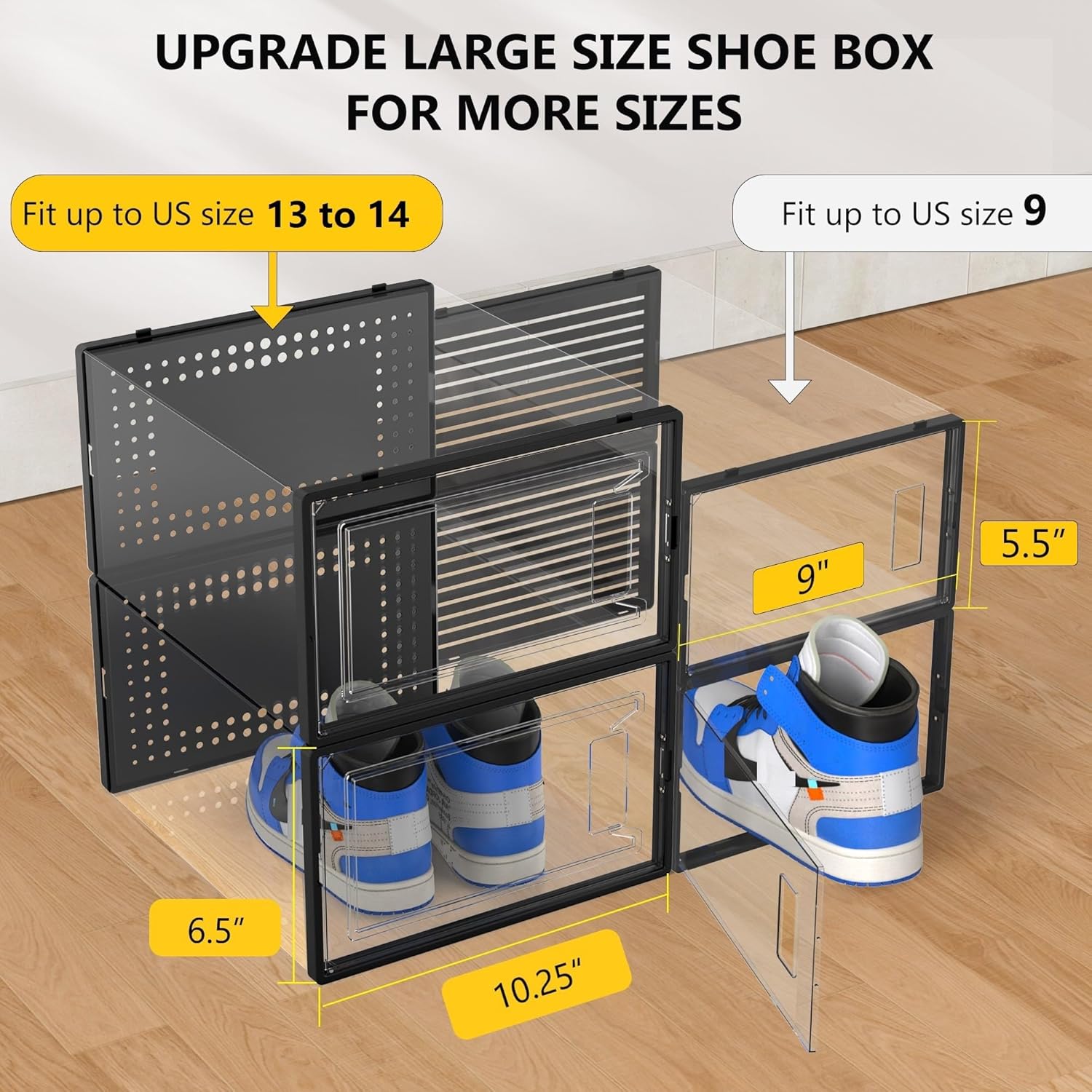 • XXX Large Size Shoe Box: Upgraded wider and higher shoe organizer fit for larger shoes size . Unit size is 14.2"(L) x 10.25"(W) x 6.5"(H), fits for women’s shoes up to US size 14 and men’s shoes up to US size 13. Suitable for many types of shoes such as heels, flats, sneakers, leather shoes, sandals, wedges, and others shoes.