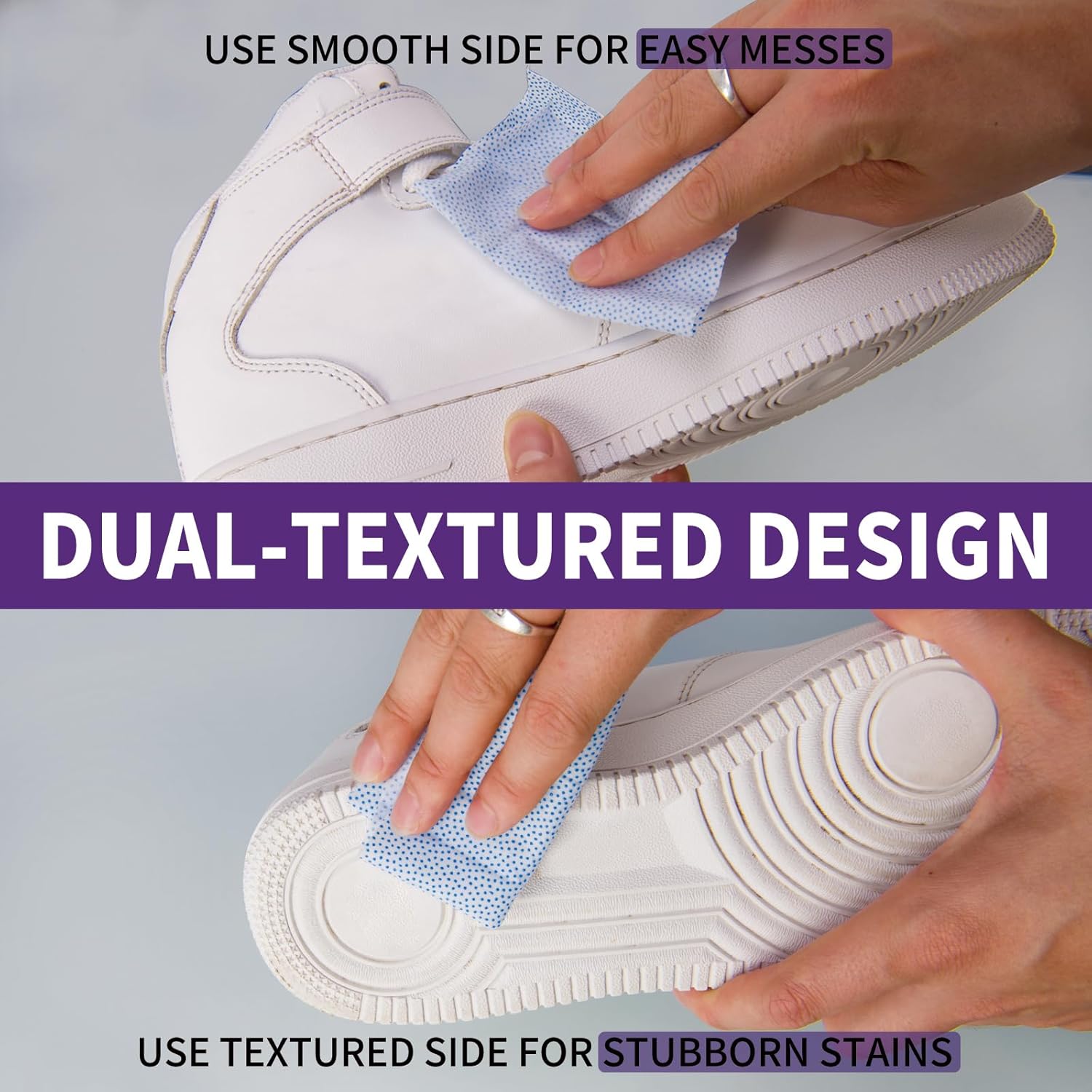 • Innovative Sneaker Care: At Henviro, we believe premium sneakers deserve premium care.The advanced dual-texture cleaning wipes go beyond the basics—crafted with raised scrubbing points for targeted stain removal and a smooth side for effortless surface cleaning. This innovative design delivers a powerful, waterless clean that lifts dirt, mud, grass, and grime with precision—no drying time, no mess.