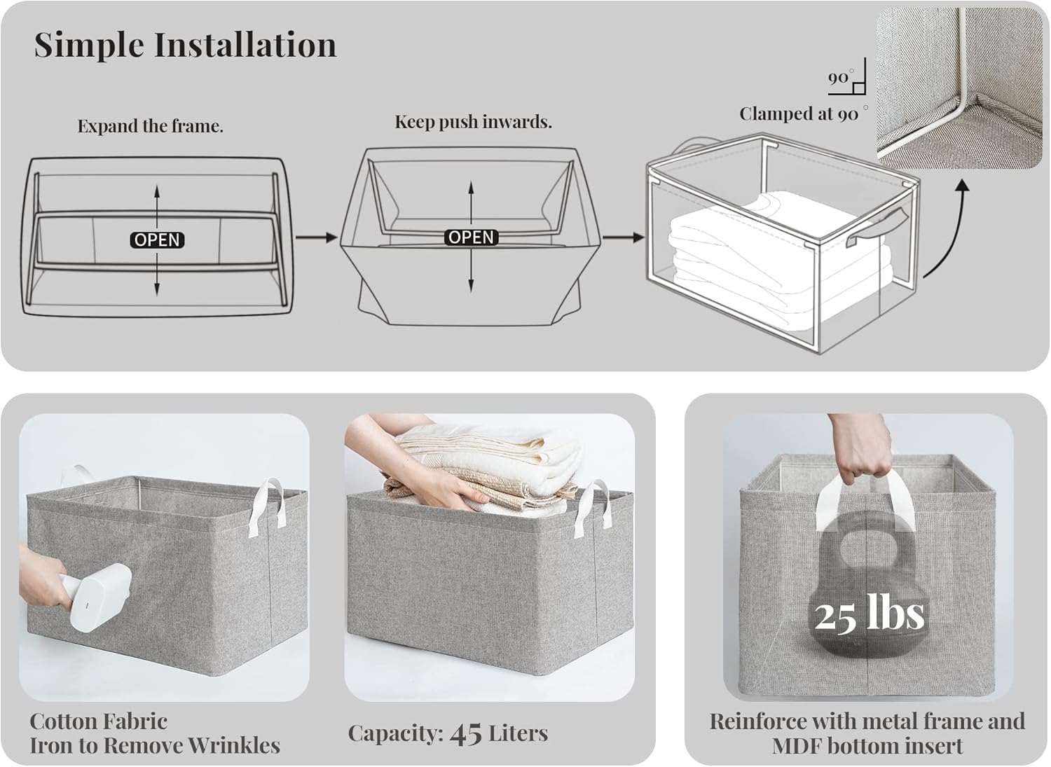 • Structured Stability: Metal frame and reinforced bottom keep bins standing tall, preventing collapse even when packed with heavy sweaters or bath towels.