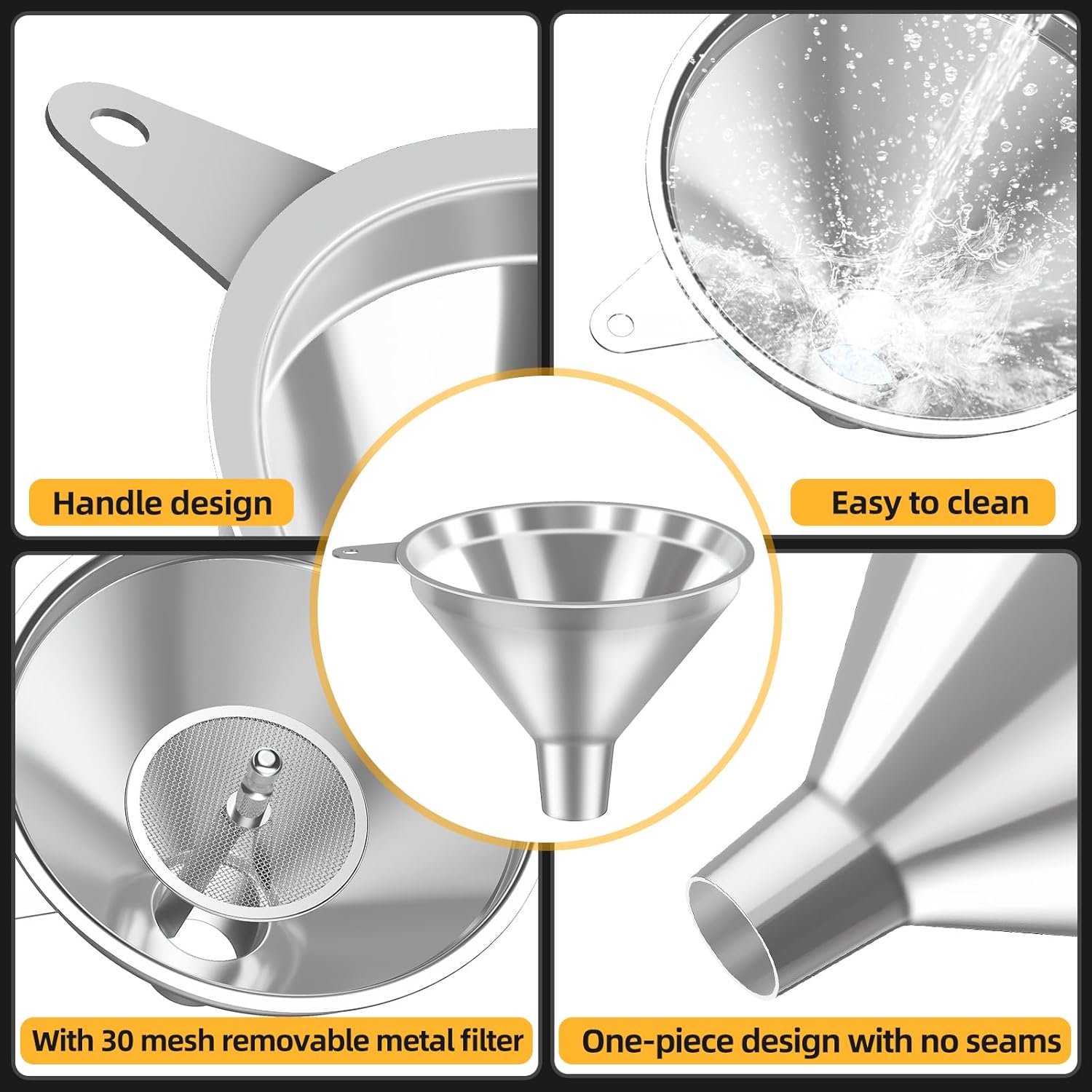 • Ergonomic Design with Side Handle – Each funnel features a sturdy side handle for easy holding and stability during pouring, preventing spills and messes in the kitchen