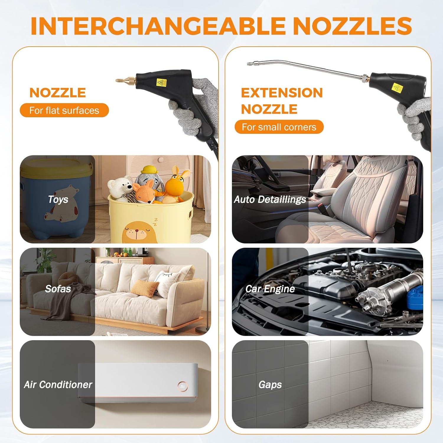 • **Portable & Flexible: Lightweight with a convenient handle for easy maneuverability. Extended power cord, water tube, and explosion-proof steam pipe provide a wide cleaning range.
