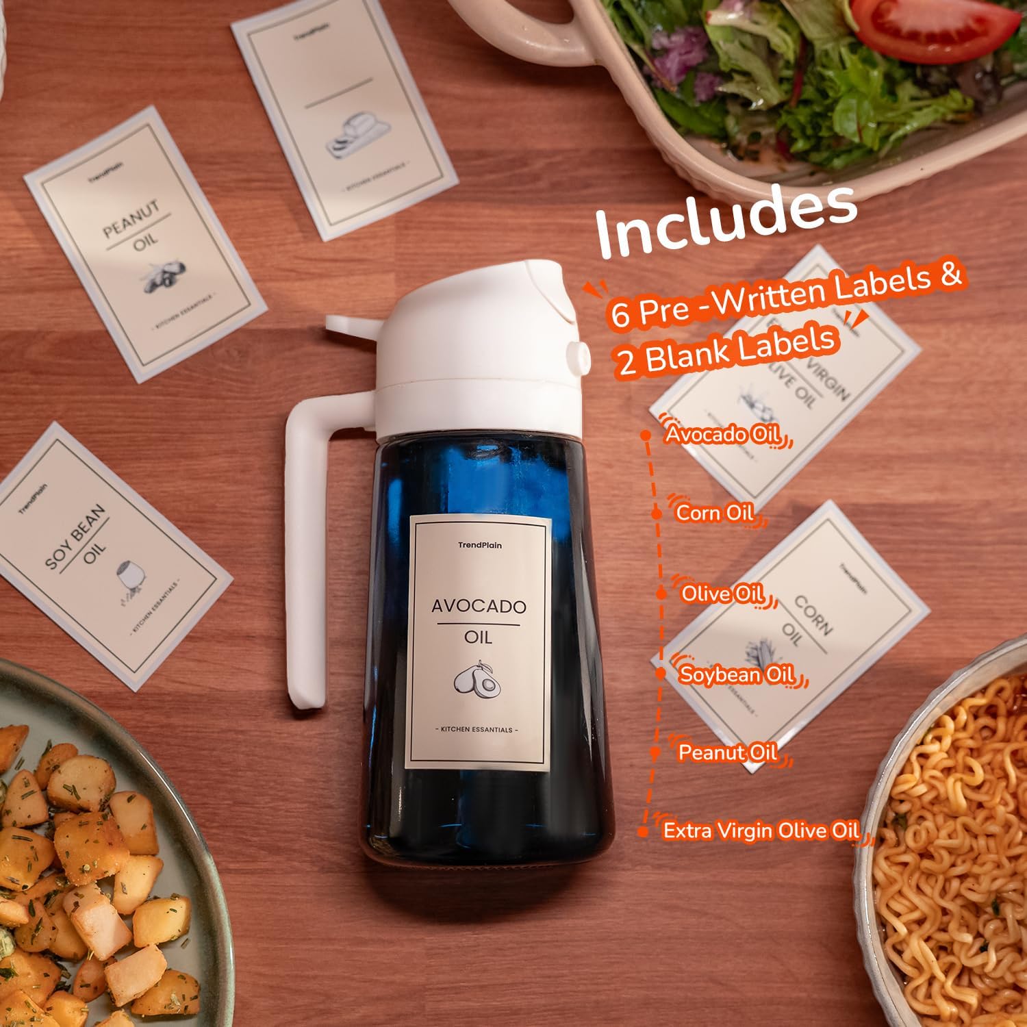 TrendPlain 16oz/470ml Blue Glass Olive Oil Sprayer for Cooking - 2 in 1 Olive Oil Dispenser for Kitchen Gadgets, Air Fryer, Salad, and BBQ - White