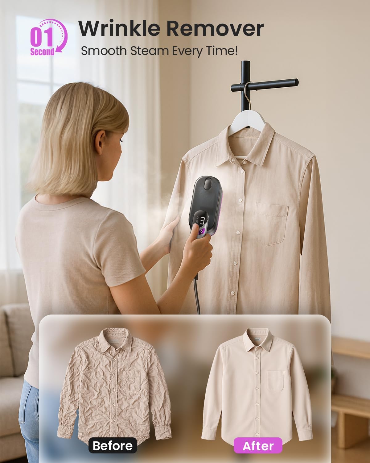 • [9-Sec Heat Up, 10 Mins of Steam]: Our steamer for clothes delivers 1000W, 120V high-performance steaming with a 9-second rapid preheat. Upgraded triple nano-steam (0.01mm) penetrates 3× deeper for stubborn wrinkles, removing them in just 30 seconds. Enjoy 10 minutes of continuous steam to refresh multiple garments quickly—perfect for busy mornings, last-minute touch-ups, or travel