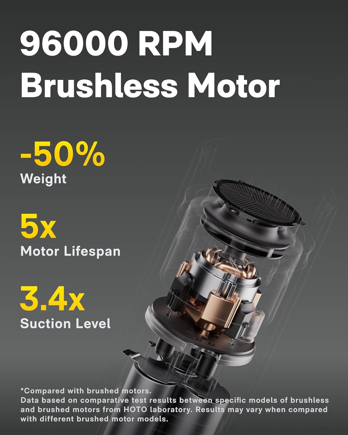 • NO MORE INVISIBLE STUBBORN DUST: Equipped with a 96,000 RPM brushless motor, the HOTO handheld car vacuum cleaner delivers powerful and sustained 20,000 Pa suction, effectively removing stubborn dust and debris from car crevices, desktops, computers