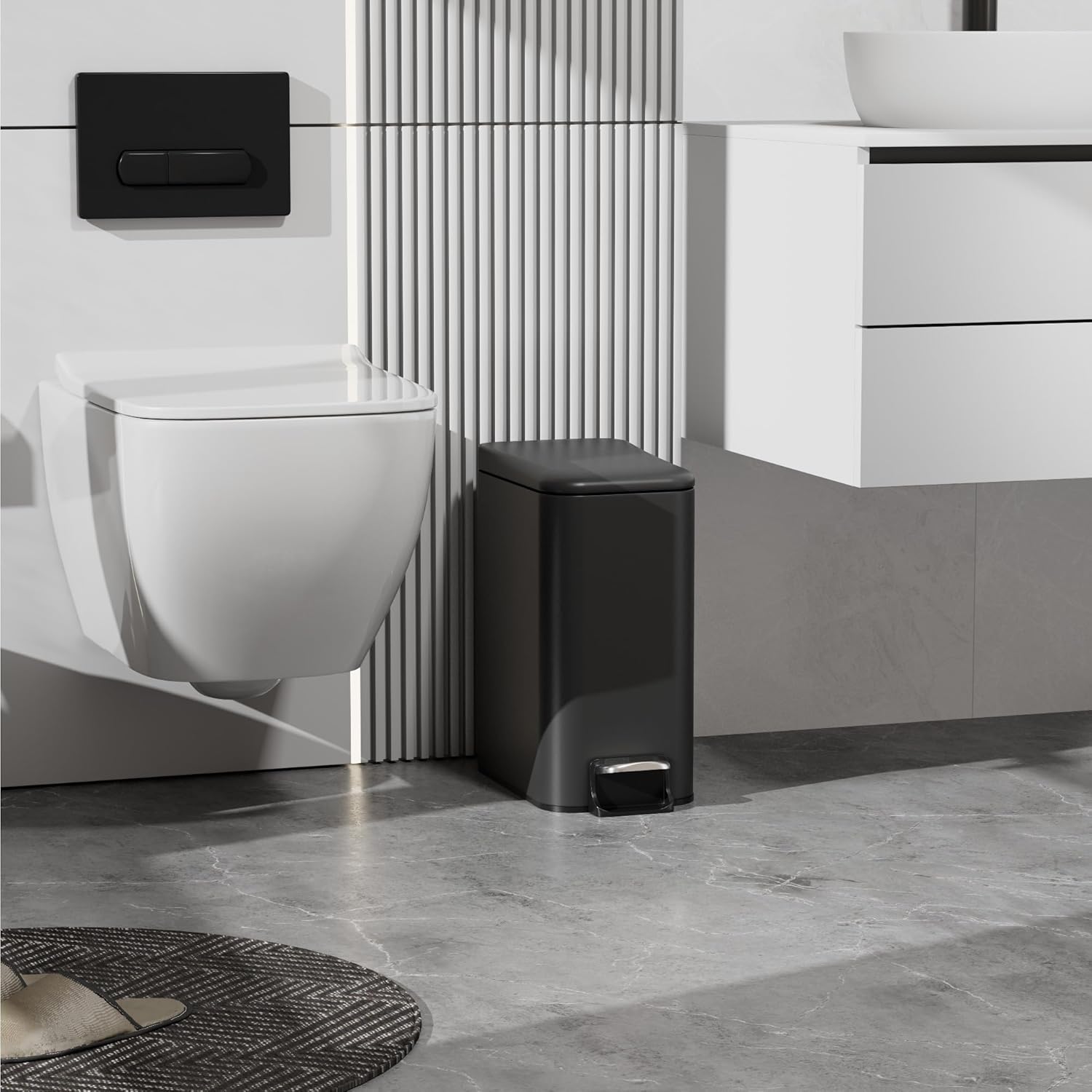 • Compact & Practical: This bathroom trash can with a lid measures just 5.5 inches wide, making it ideal for any corner of your home, office or bathroom. Besides, the bathroom trash can locks at a 90° angle for continuous disposal of multiple pieces of trash. With lid design keeps tidy contained even if knocked over