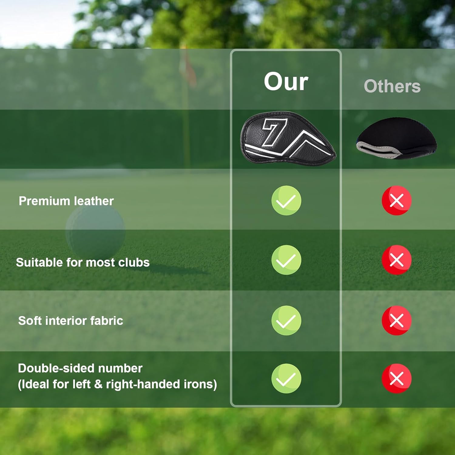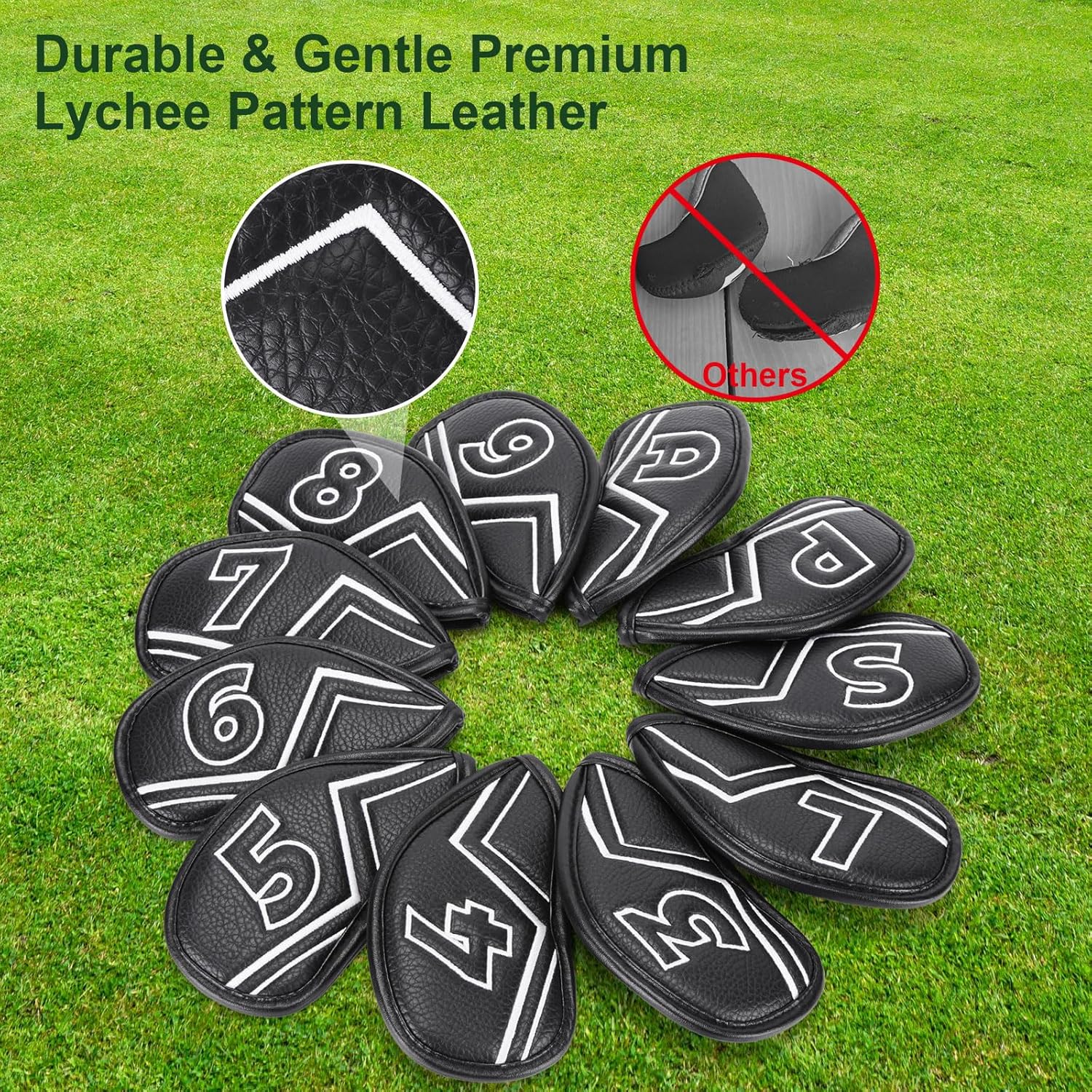 • 【Set of 11 to Fit Most Golf Clubs】This golf head cover set includes 11 head covers designed to fit most standard golf clubs. These magnetic leather golf iron head covers can provide the protection and organisation your clubs need.