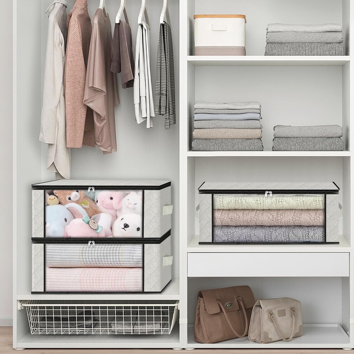 HomeHacks Storage 4-Pack Clothes Organizer Storage Bags Foldable Storage Box with Large Clear Window Sturdy Handles for Closet, Dorm, Pillows, Bedding, Clothes, Blankets, 35L, Ivory