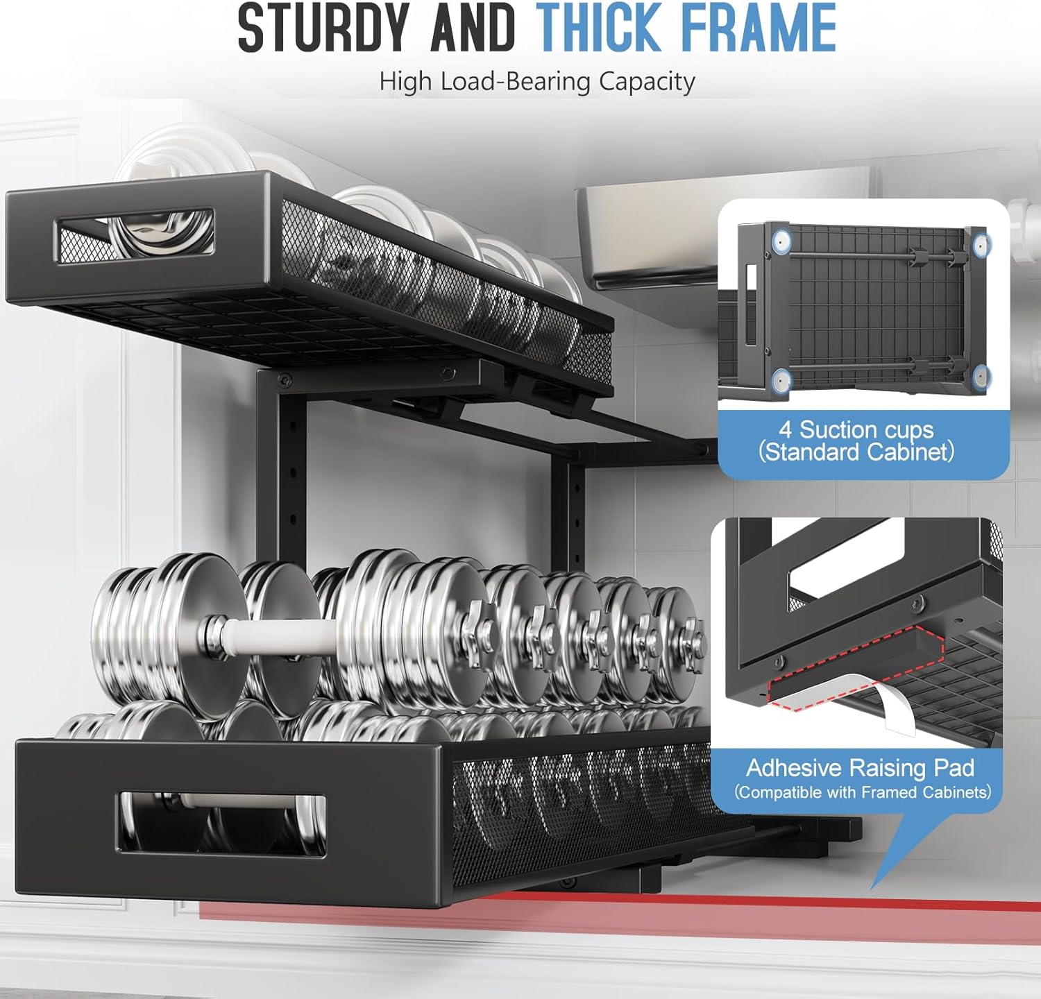 • 【2-Tier Pull-Out Design for Easy Access】This under-sink organizer features a double-layer pull-out design, allowing you to easily access items at the deepest part. The upgraded, thickened iron circular sliding rails ensure a smooth and seamless pulling experience, making each use effortless. The unique pull-out locking mechanism effectively prevents the drawers from being completely pulled out, avoiding the risk of items falling or structural damage caused by over-pulling, ensuring safer