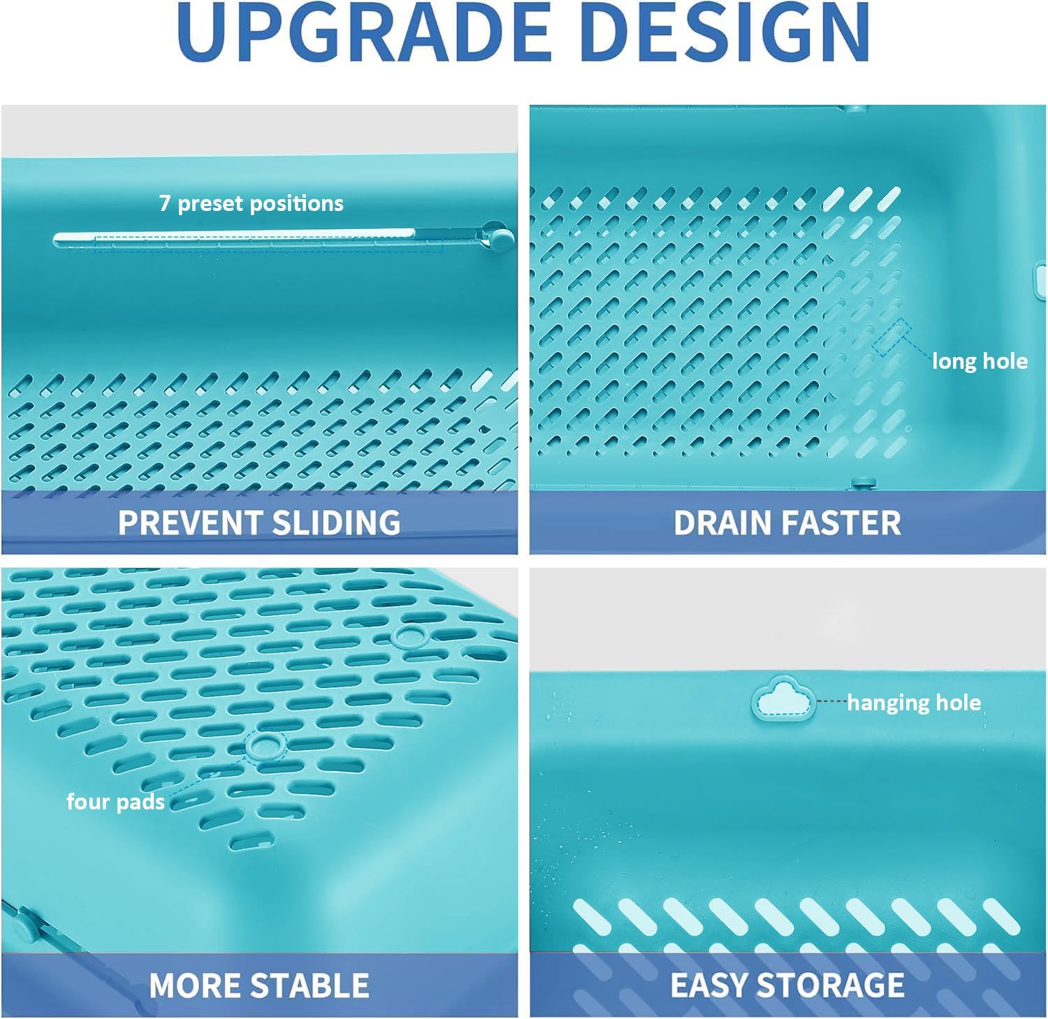 • LASSHSWA upgrade the colander, 7 preset positions - PREVENT SLIDING, long hole - DRAIN FASTER, four pads - MORE STABLE, hanging hole - EASY STORAGE.