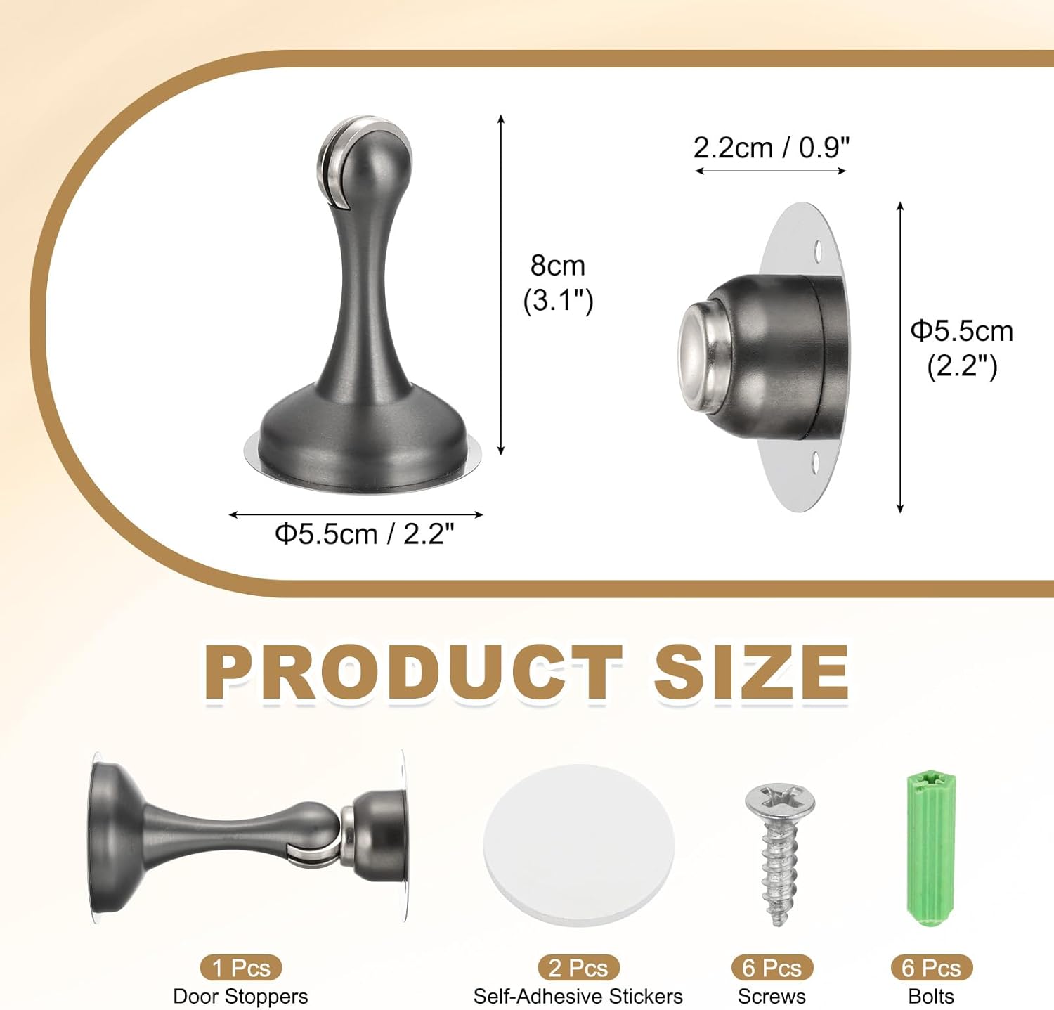 • Package contains 1pcs x Door Stoppers, 6pcs x Screws, 6pcs x Bolts, 2pcs x Self-Adhesive Stickers. Mounting Plate Size: 5.5 x 2.2 cm / 2.2 x 0.9 inch (Dia*H), Base Size: 5.5 x 1 cm / 2.2 x 0.4 inch (Dia*H), Total Height: 8 cm / 3.1 inch