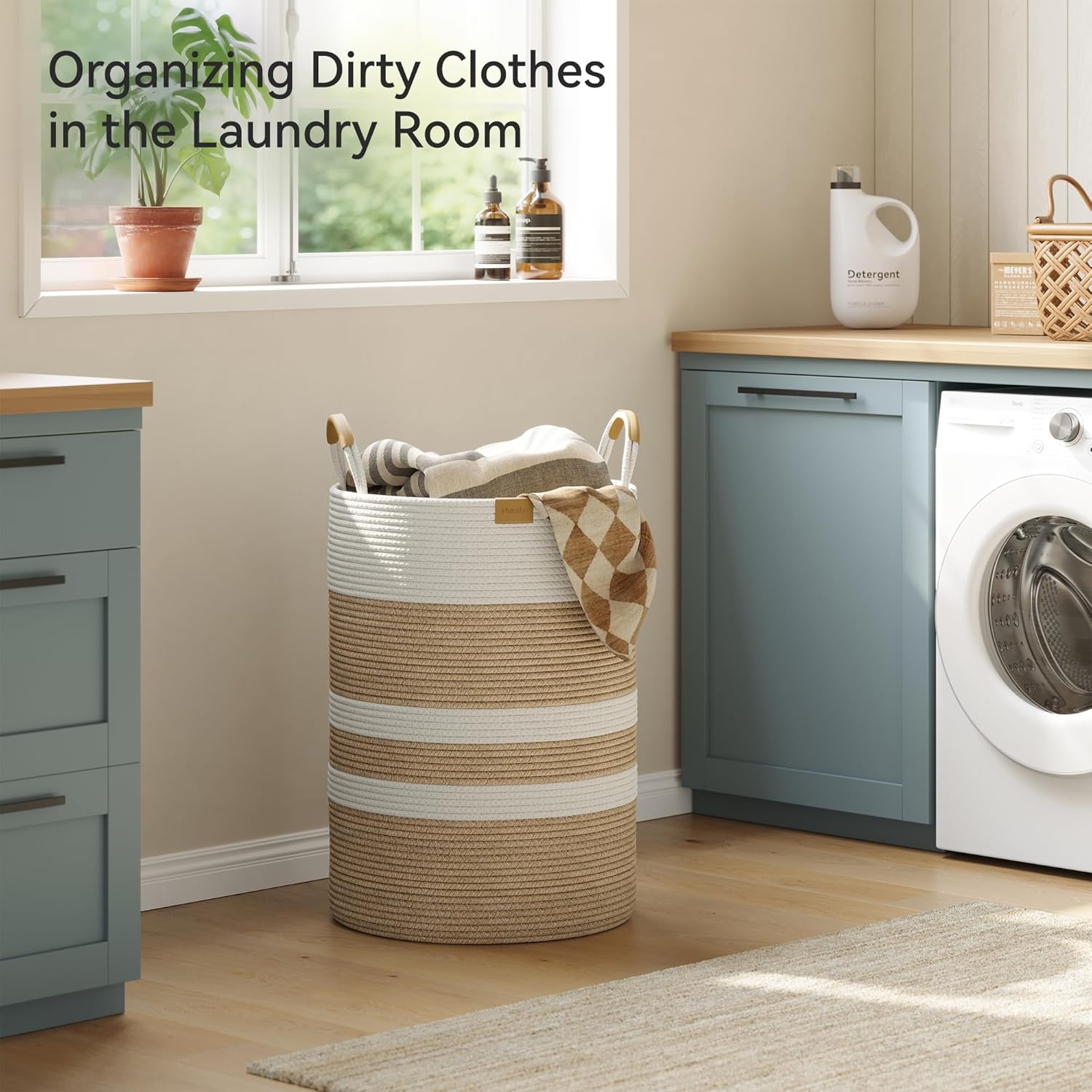 95L Striped Laundry Hamper with Leather Handles,Large Foldable Laundry Basket for Clothes,Cotton Rope Storage Bin for Blankets,Woven Clothes Basket for Bedroom,Beige Stripes