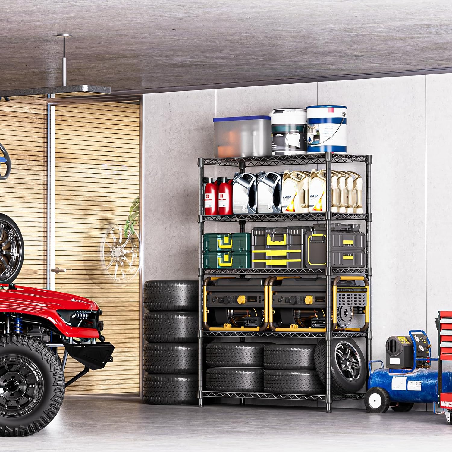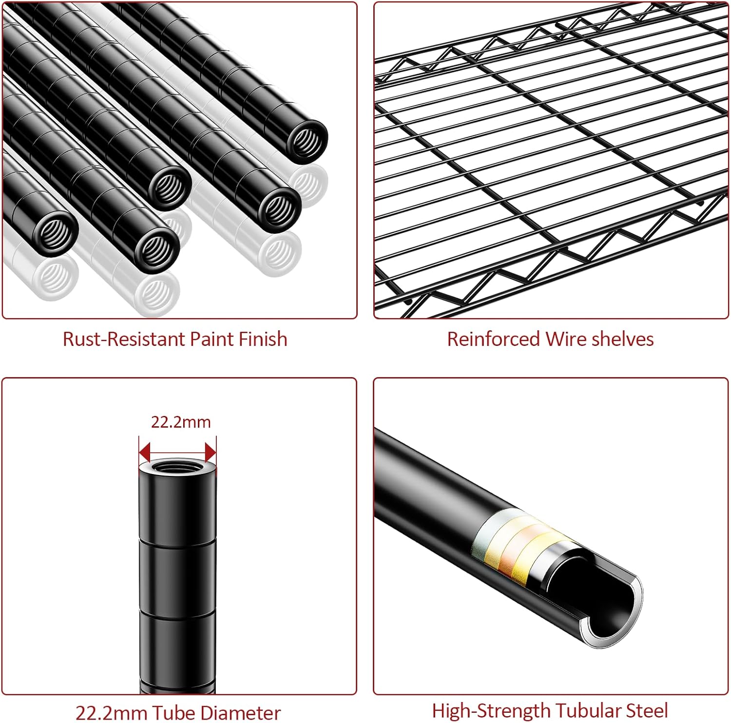• 【Heavy-Duty Carbon Steel – Ultra-Stable Design】Built with premium carbon steel and 22.22mm reinforced pipes, this shelving rack is engineered for strength and durability. Each shelf supports up to 350 lbs, with a total capacity of 1750 lbs, offering solid support for your heavy tools, appliances, or storage bins.