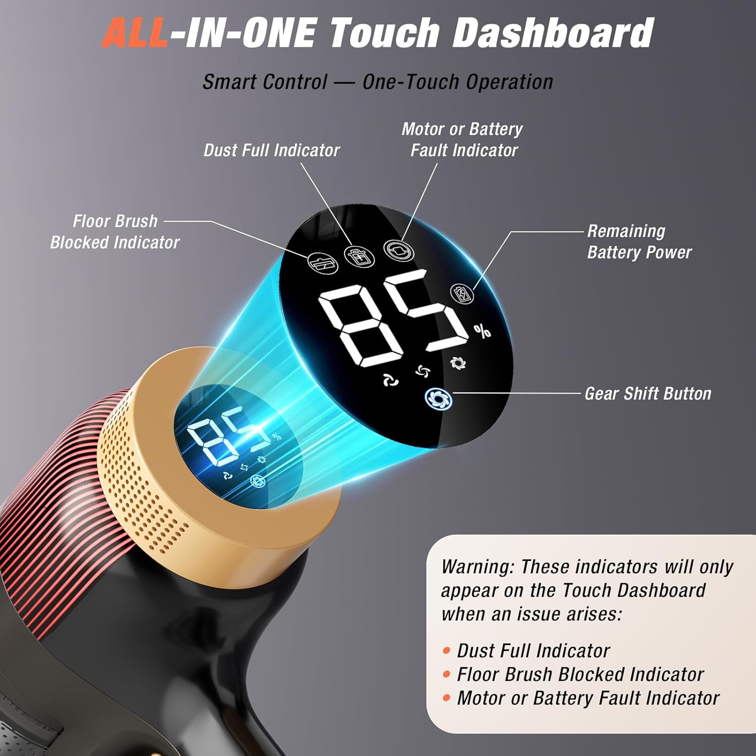 • 【LED Smart Touch Screen】 This vacuum cleaners for home features an LED smart touch screen, allowing you to adjust suction power via touch. You can also conveniently monitor battery life, dust cup fullness, and filter maintenance status, enjoying intelligent cleaning. The vacuum’s telescopic handle features an ergonomic design, enabling you to easily adjust the length for different cleaning scenarios.
