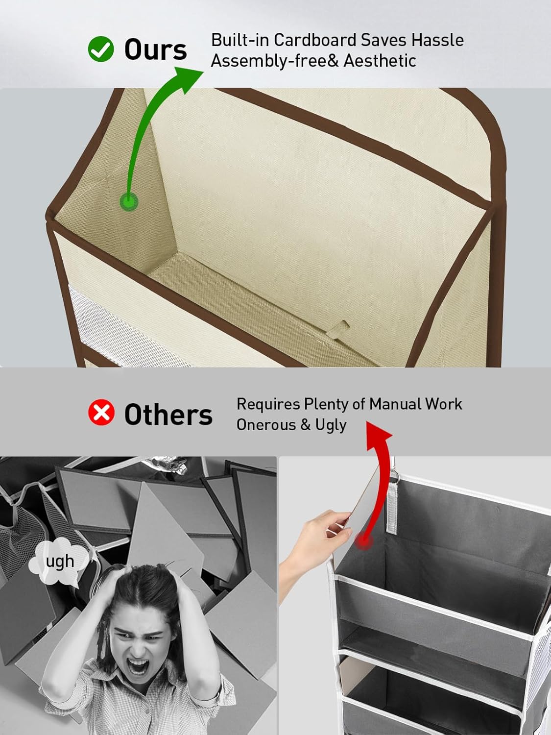 • Easy Assembly, No Hassle: Unlike other brands' door hanging organizer bedroom that comes with piles of cardboard that need complicated manual assembly, Our over the door storage comes pre-inserted with cardboard in the pockets, giving you a tool-free assembly within seconds. Simply hang the hooks over the door, then hang the over door storage, insert 5 cardboard bottoms, and you're ready to go