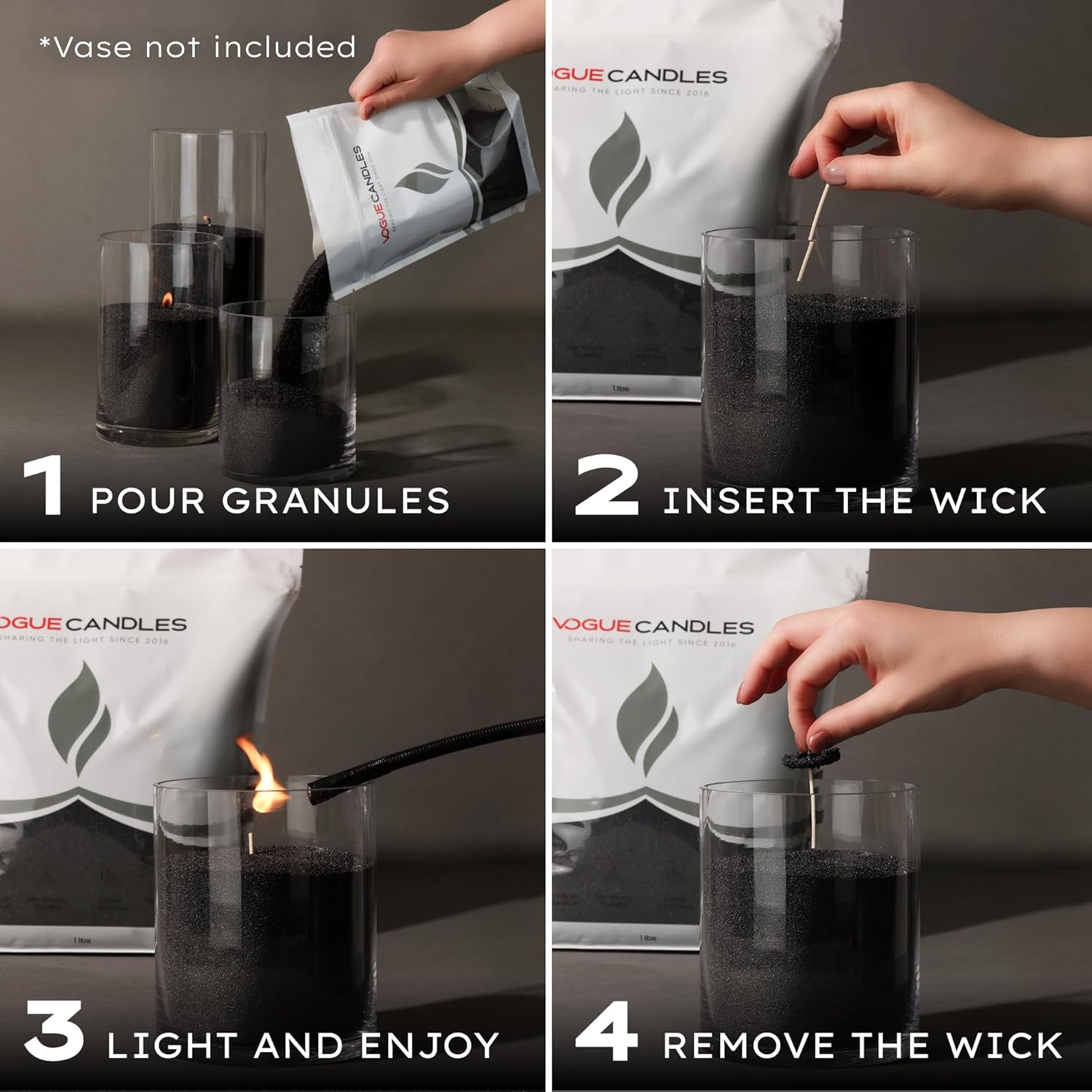 • Create a Candle, Your Way. No Mold, No Mess: Our signature plant based granules turn any vase or vessel into a stunning candle. Each 1LB kit includes 15 clean-burning cotton wicks. Each 5LB kit includes 50 wicks for extended use or gifting. Just pour to 2/3 full, insert a wick vertically, and light. No wax pouring or molds required. Every setup is unique, every candle is yours.