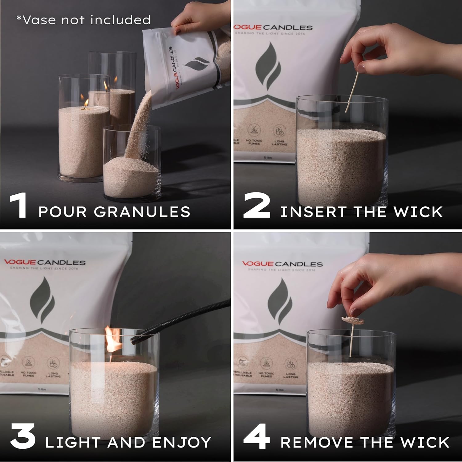 • Create a Candle, Your Way. No Mold, No Mess: Our signature plant based granules turn any vase or vessel into a stunning candle. Each 1LB kit includes 15 clean-burning cotton wicks. Each 5LB kit includes 50 wicks for extended use or gifting. Just pour to 2/3 full, insert a wick vertically, and light. No wax pouring or molds required. Every setup is unique, every candle is yours.