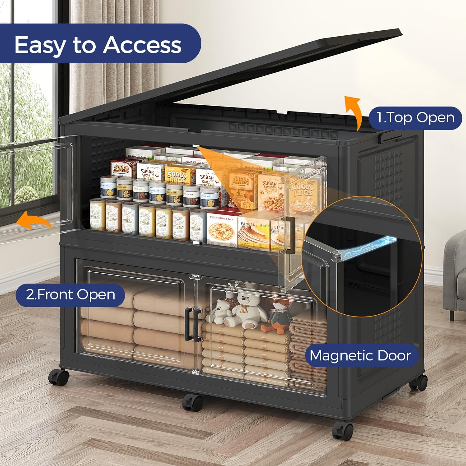 • 【Two Ways to Open & Clear Magnetic Door】The collapsible storage bins with lids and wheels feature a dual access way, allowing for both top and front door openings, and with clear windows for easy visibility. The stackable plastic storage bins with open front doors are equipped with magnetic lock buckles to prevent dust from entering the cabinet.