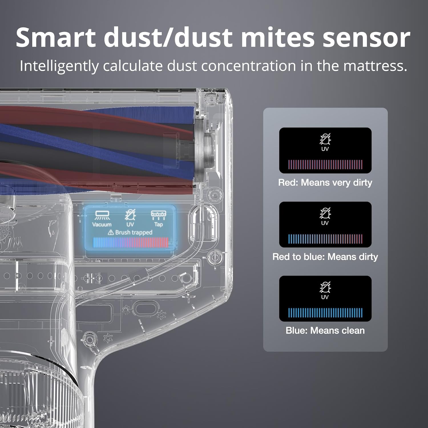• Intelligent Dust Sensor: Our unique DustSensor technology calculates the amount of dust on your bed automatically, and the LED lights will display the results - red light means dirty, while green light means clean.