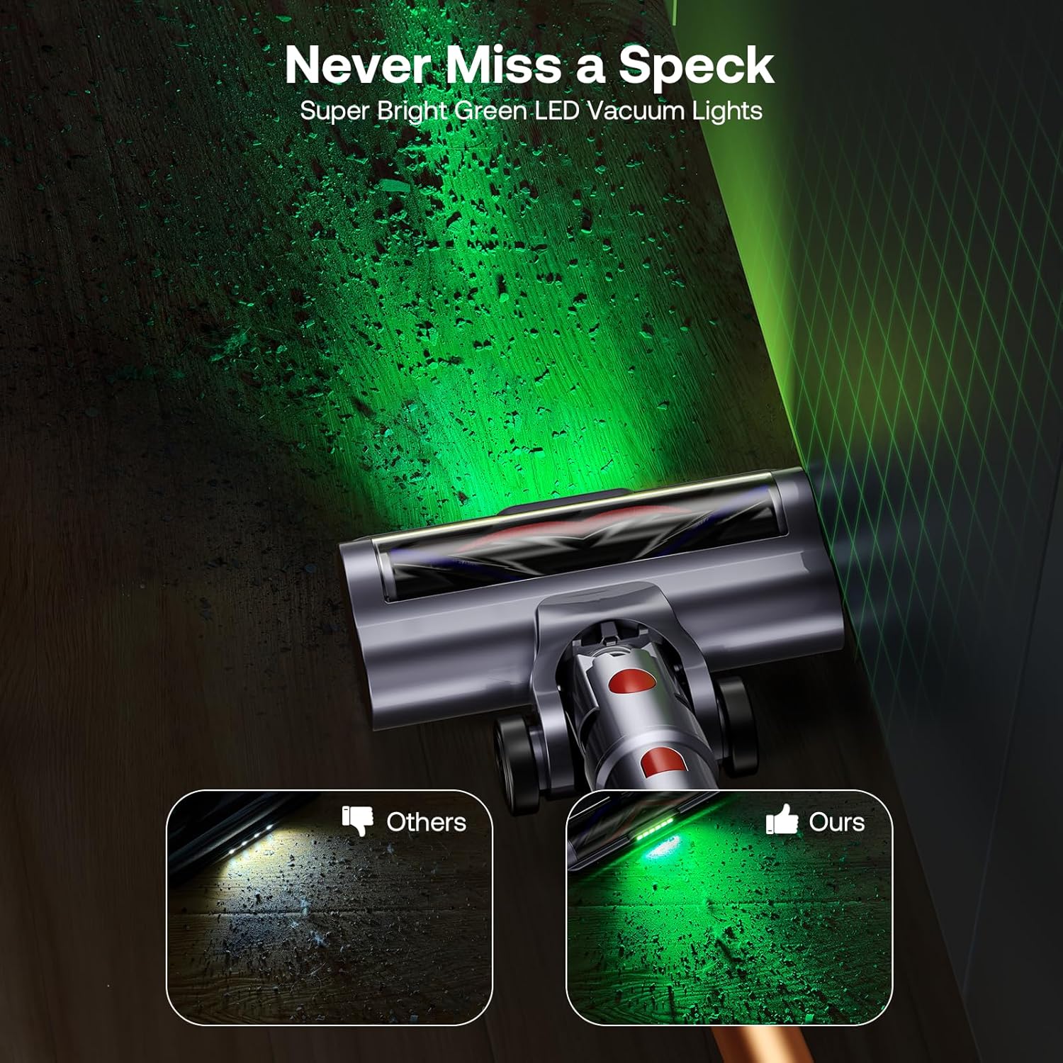 • [Green LED Headlight & Wide-Angle Floor Brush] Upgraded Green LED headlight projects a long-range beam to expose hidden debris under furniture. The green light offers superior dust visibility over white lights. Combined with wide swivel steering, Trucozie T550 vacuum cleaner for home easily cleans around obstacles and under low furniture. white lights. Combined with wide swivel steering, Trucozie T550 vacuum cleaner for home easily cleans around obstacles and under low furniture.