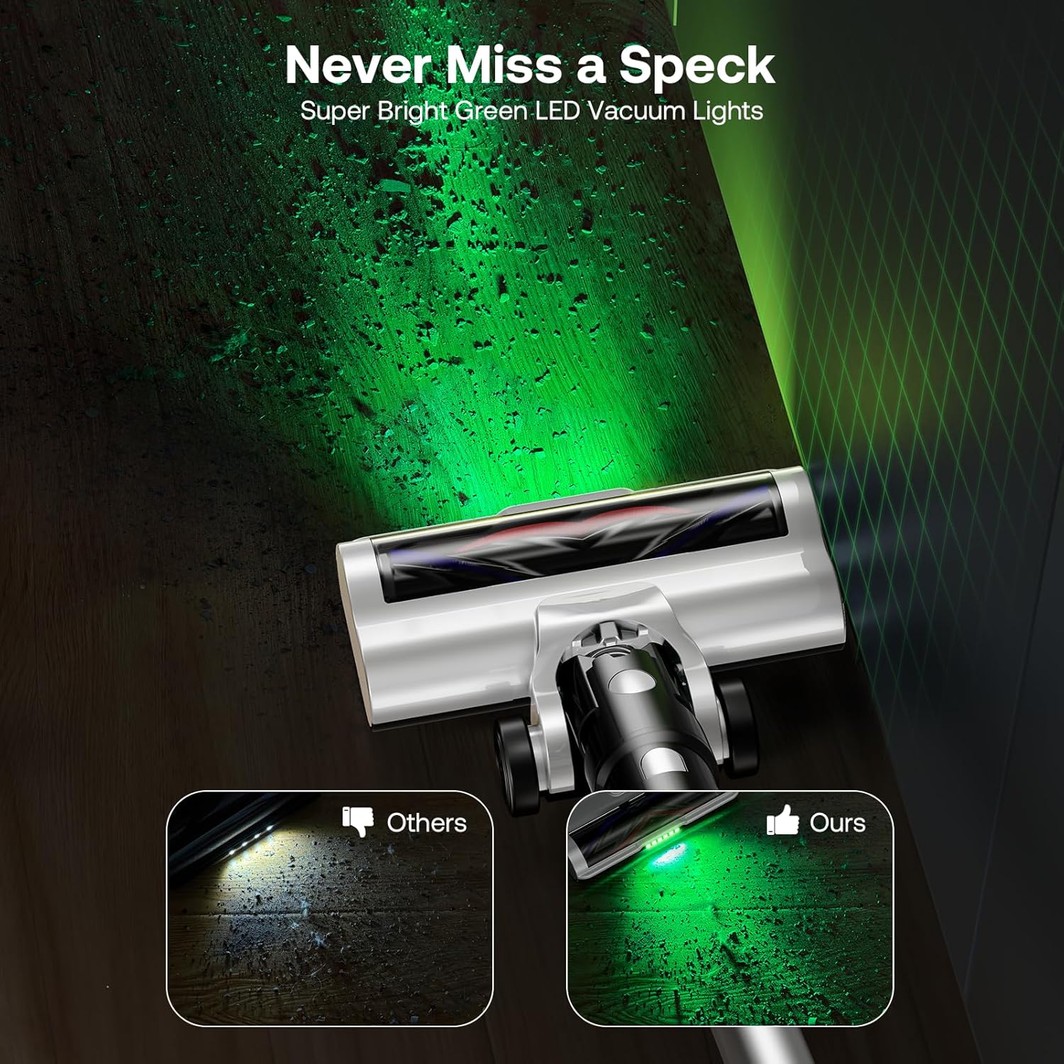 • [Green LED Headlight & Wide-Angle Floor Brush] Upgraded Green LED headlight projects a long-range beam to expose hidden debris under furniture. The green light offers superior dust visibility over white lights. Combined with wide swivel steering, Trucozie T550 vacuum cleaner for home easily cleans around obstacles and under low furniture. white lights. Combined with wide swivel steering, Trucozie T550 vacuum cleaner for home easily cleans around obstacles and under low furniture.