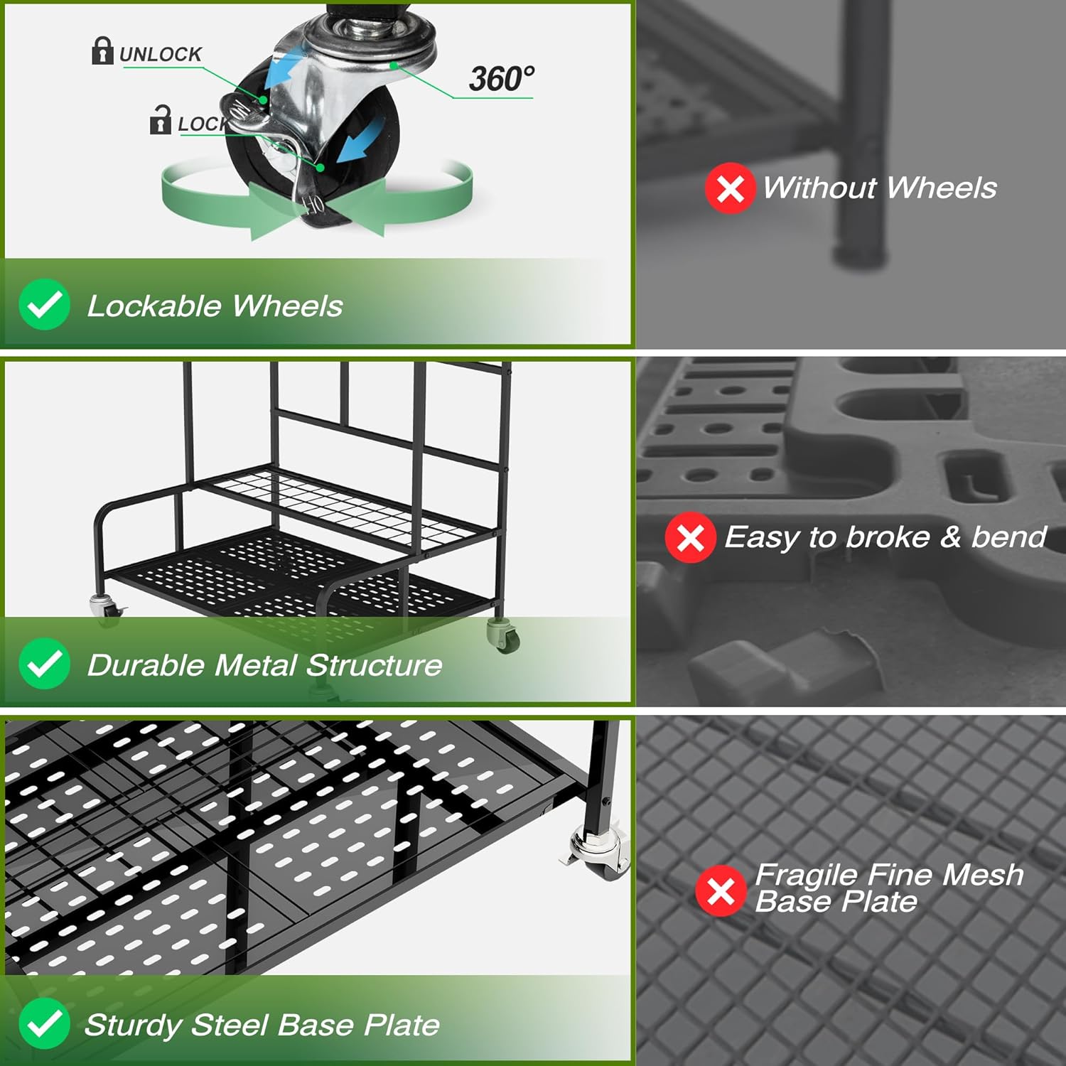 • Easy to Move and Assemble:Four lockable wheels for easy mobility,move the rack effortlessly and fix it in place when needed during use. Easily reposition for cleaning or reorganization. Beyond being easy to move, this garden tool stand prides itself on an uncomplicated assembly process. Accompanied by screws and wrenches, setting it up is a breeze. The provided instruction manual offers clear, step-by-step guidance, enabling you to put it together within minutes without breaking a sweat.