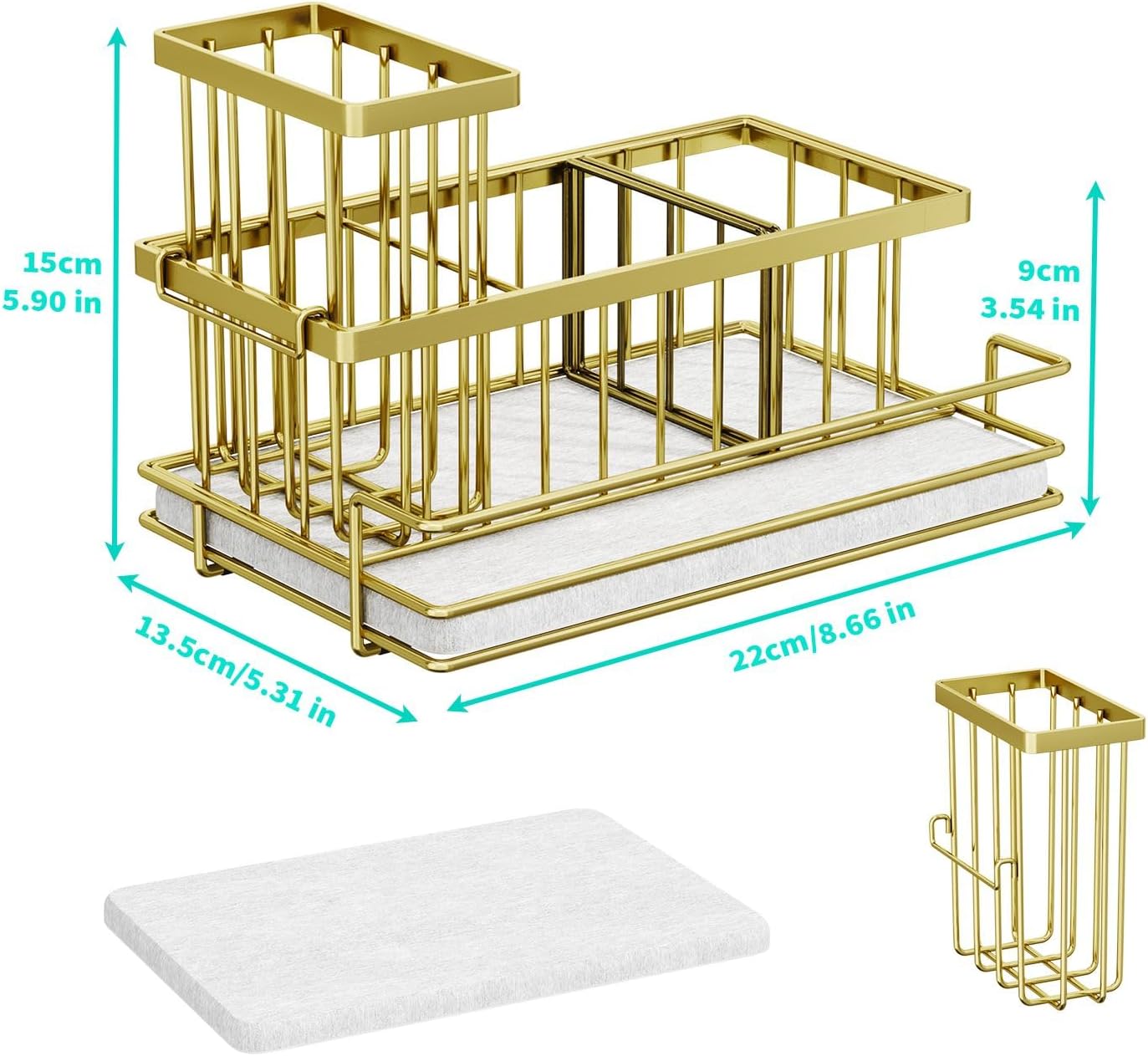 • [Save Space]: Our sink caddy kitchen sink organizer measures 8.66×5.31×3.54 inches (L × W × H). Its decent capacity allows it to hold your kitchen essentials without taking up too much space