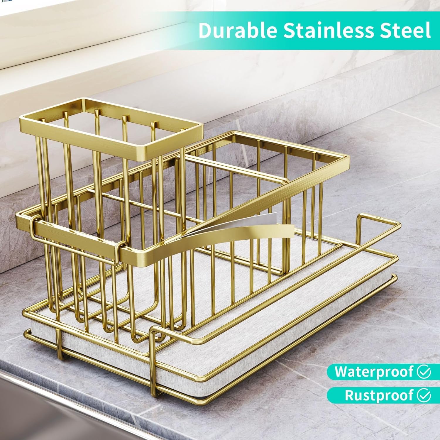 HapiRm Sink Caddy Sponge Holder - Kitchen Sink Organizer with Instant Drying Stone and Brush Holder, Stainless Steel Sponge Caddy for Kitchen Countertop - Gold