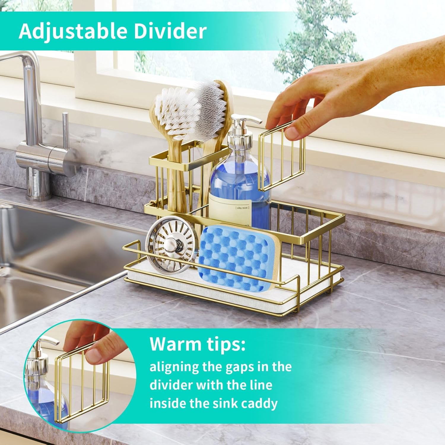 • [3 Partition Design]: HapiRm sink sponge holder has 3 compartments, perfect for storing sponges, detergent bottles, sink stopper and other items. This partition design means you don't have to worry about your items getting mixed up