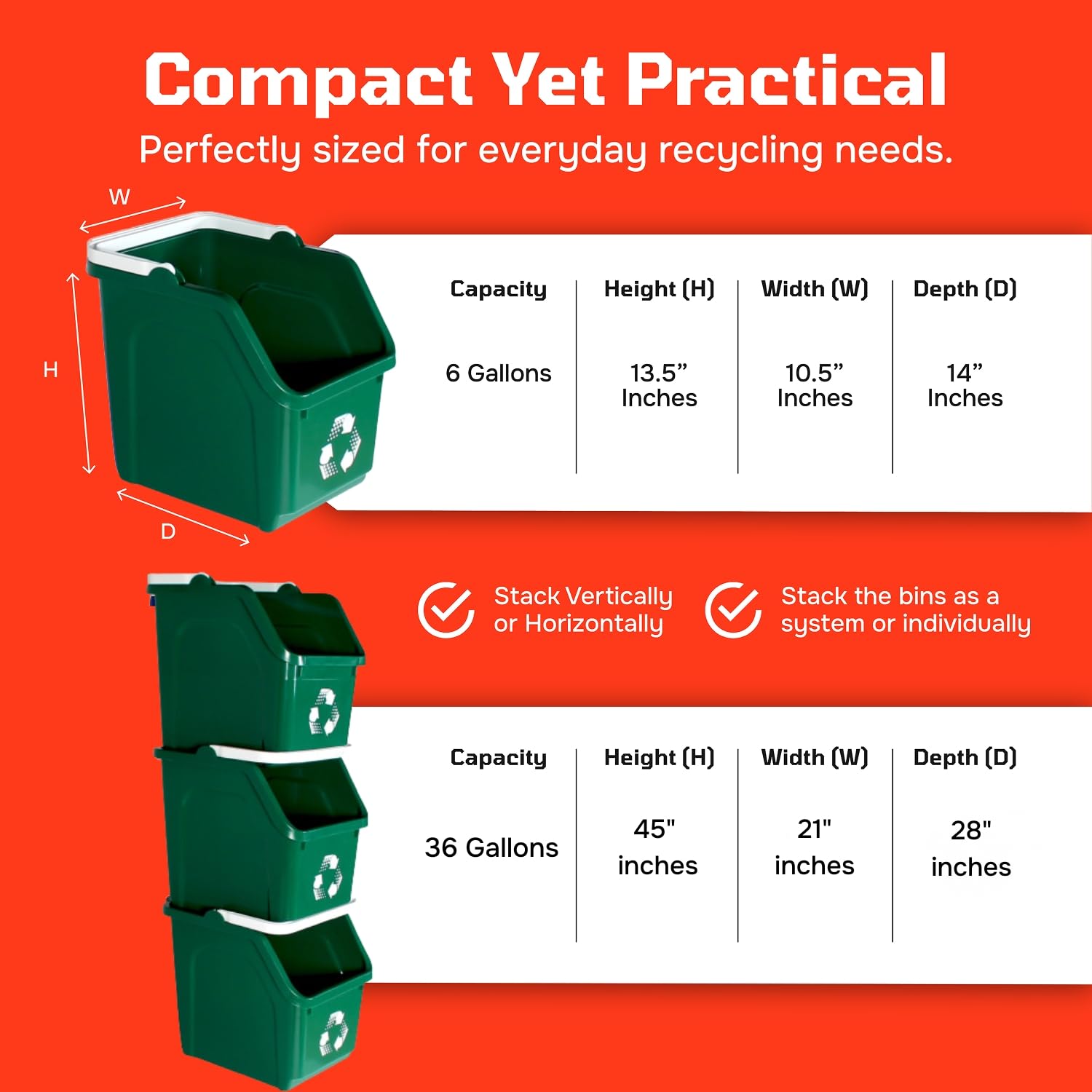 • STURDY AND STACKABLE: These stacking recycling bins are made to maximize efficiency, allowing you to create a 3 bin recycling center or combine multiple units as needed. They’re designed to stay securely stacked without slipping or wobbling.