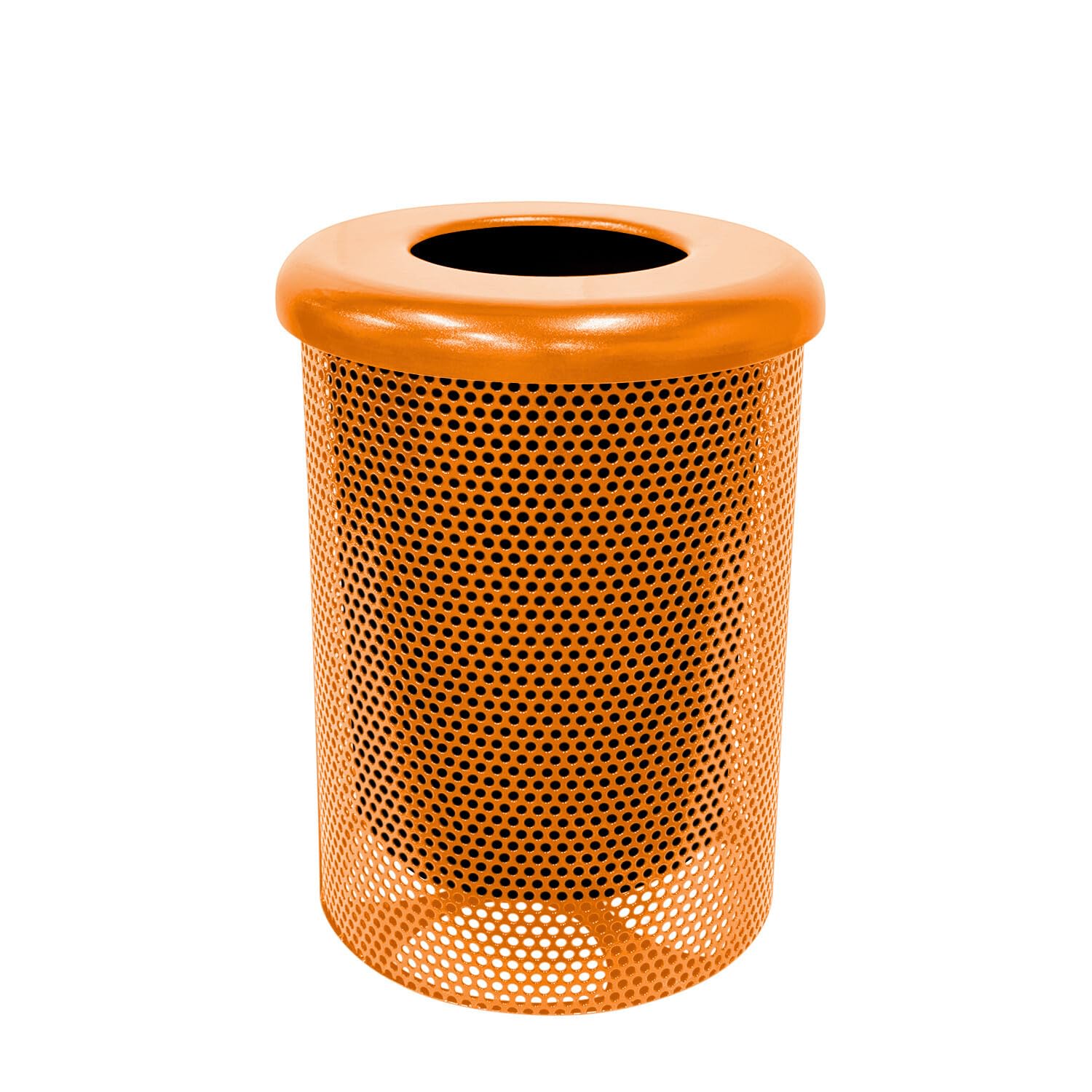 Coated Outdoor Furniture 32-Gallon Heavy-Duty Punched Steel Round Trash Receptacle, Commercial Outdoor Waste Bin with Liner & Black Flat Top Lid – Made in America (Textured Orange)