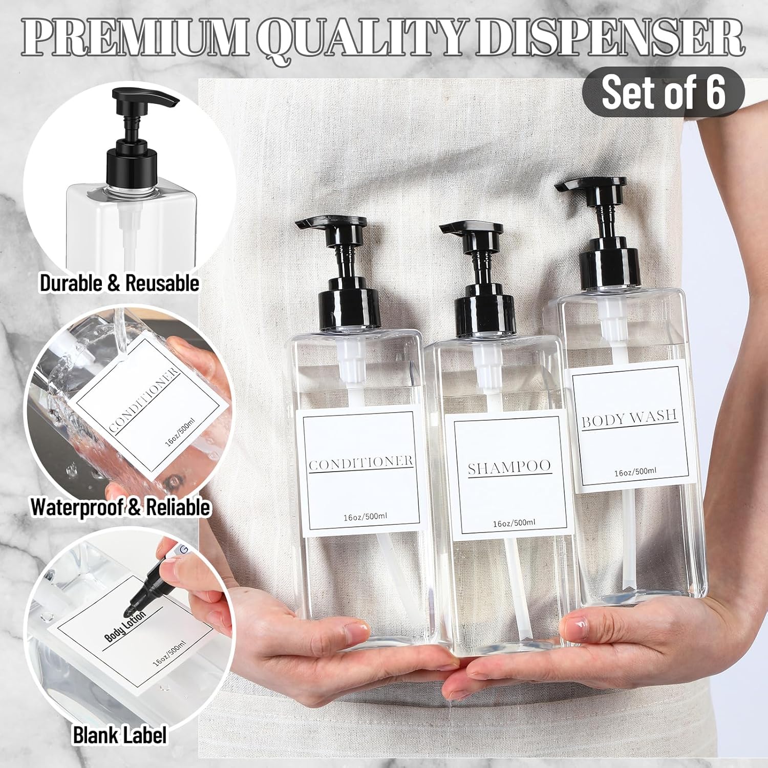Tanlade 6 Pcs Shampoo and Conditioner Dispenser Bottles 16oz Modern Shower Soap Bottles with Pump, Labels and Marker Pen Easy to Refill Body Wash Dispensers for Home Bathroom Decoration(Clear)