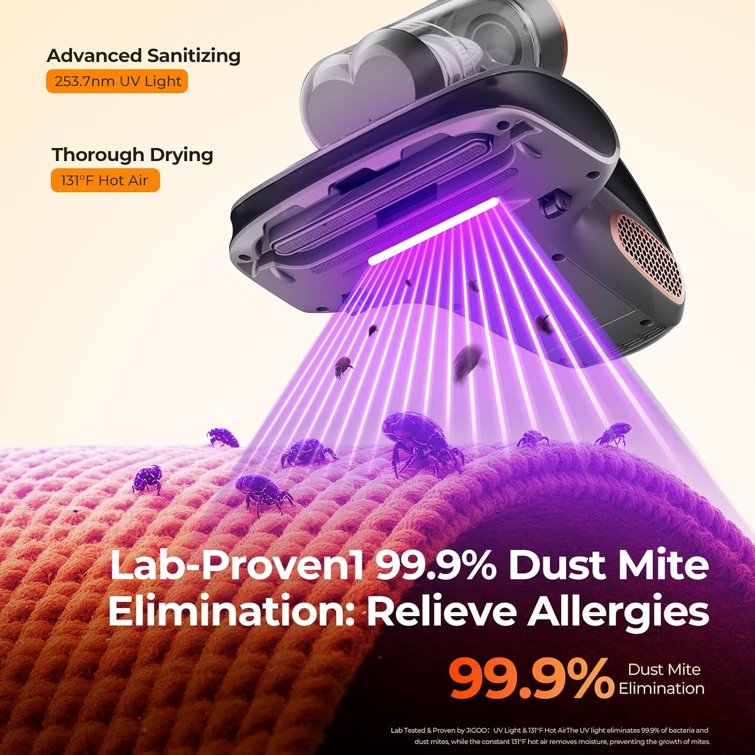 • 【Cordless, Lightweight Design for Handier Cleaning】The JIGOO S100 Cordless Mattress Vacuum Cleaner offers you great convenience and ease of use during cleaning, as you don’t have to worry about finding an outlet or dealing with a cord getting in the way, making it easier to maneuver and clean hard-to-reach areas. With a lightweight construction, it is easier to operate and carry around.