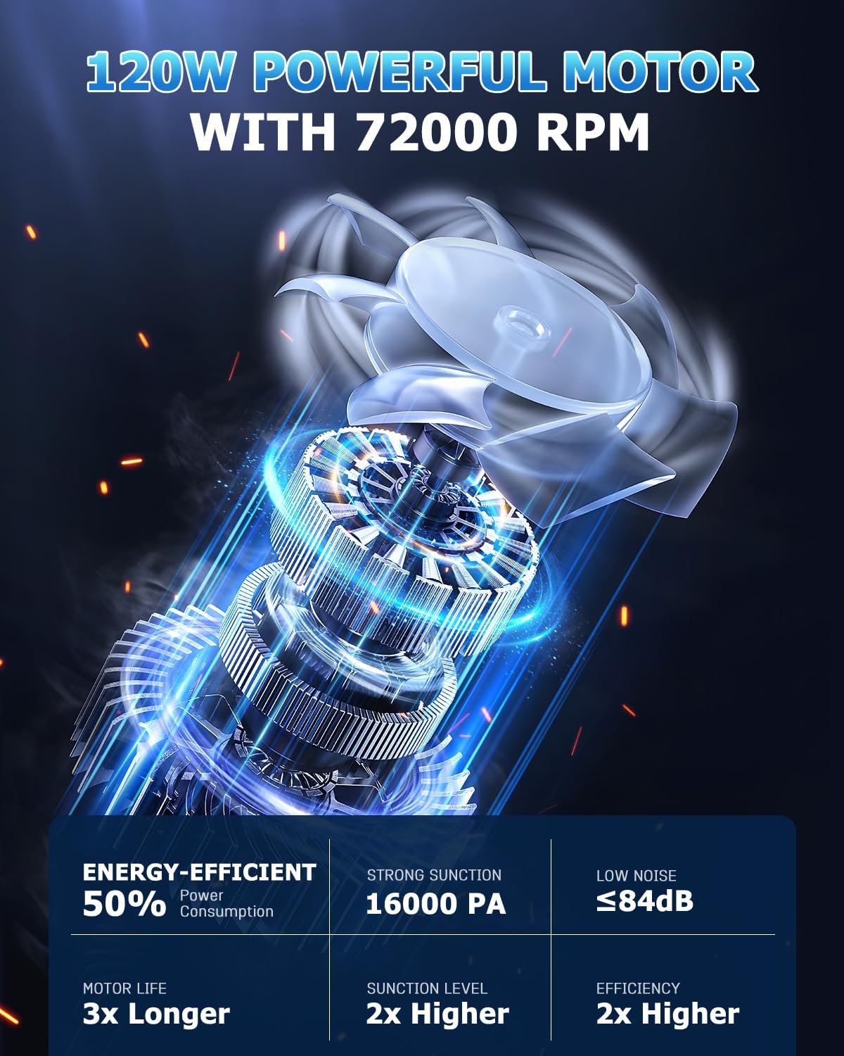 • 🌀【16KPA POWERFUL SUCTION】The dust busters cordless rechargeable is equipped with a 120W high-powered motor that spins at up to 72,000RPM and provides 16,000PA powerful suction. Whether it's dust and debris on the floor or hidden dirt in narrow crevices can be quickly cleaned. Easily cope with the cleaning of home, car interior, office desktop, efficiently clean every corner, saving you precious time and energy