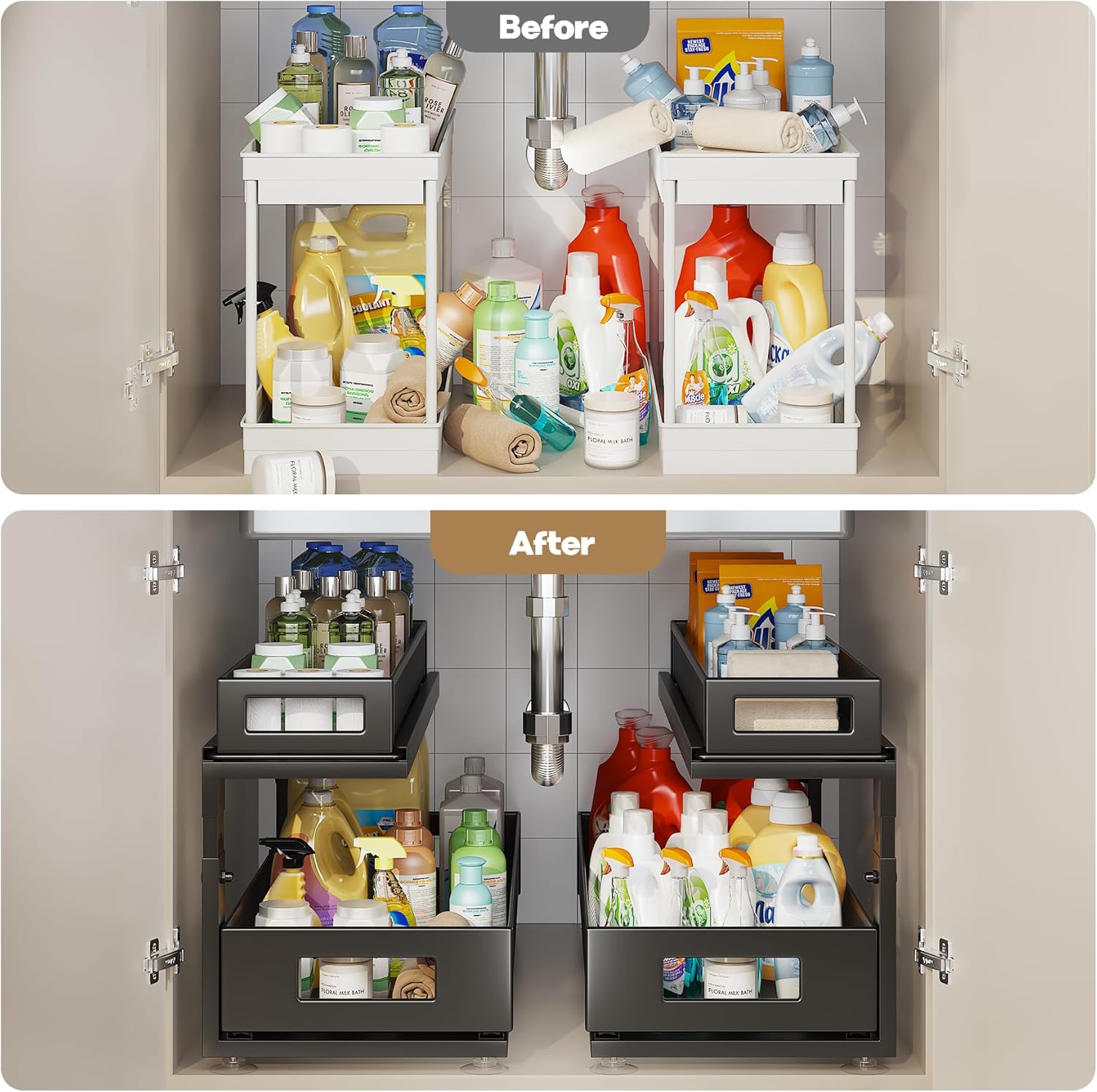 • 【Supreme-Smooth Glides】Built with heavy-duty ball-bearing slides,pull out cabinet organizer glides out smoothly and quietly,even when storing bottles,detergents,or heavy cleaning supplies.