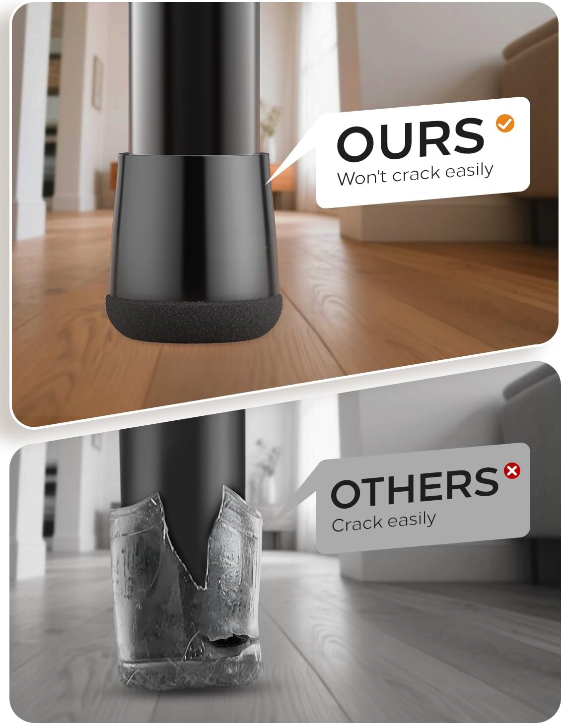 • 360° Felt-Bottom floor protectors- 360 ° fully wrapped felt design. Made from high-density industrial felt and flexible silicone to withstand daily wear, heavy chairs, and frequent movement without tearing or flattening, ensuring long-lasting floor protection.