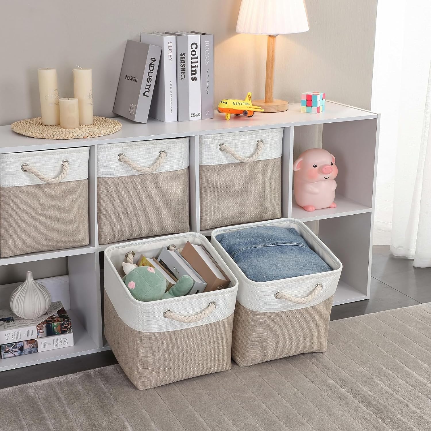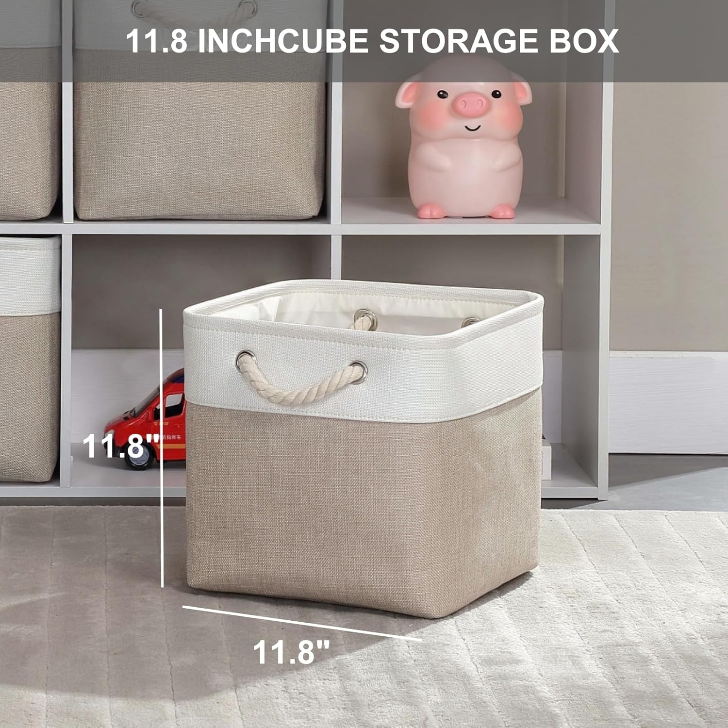 Mangata Canvas Storage Boxes, 11.8 Inch Cube Storage Bins Set of 6 for 12 Inch Cabinets, Fabric Baskets with Cotton Rope Handle for Organizing Clothes Nursery Home (Khaki/White)
