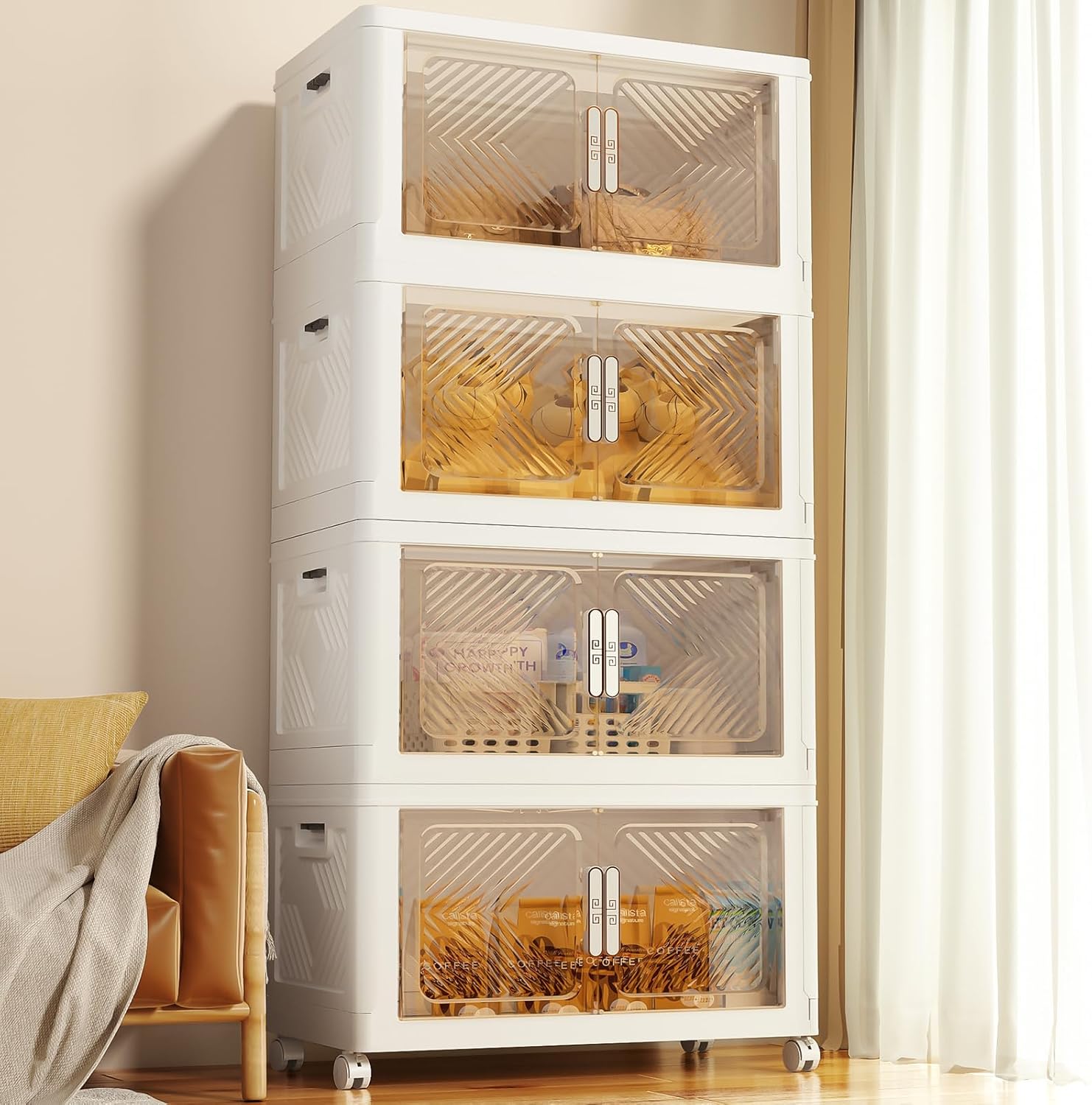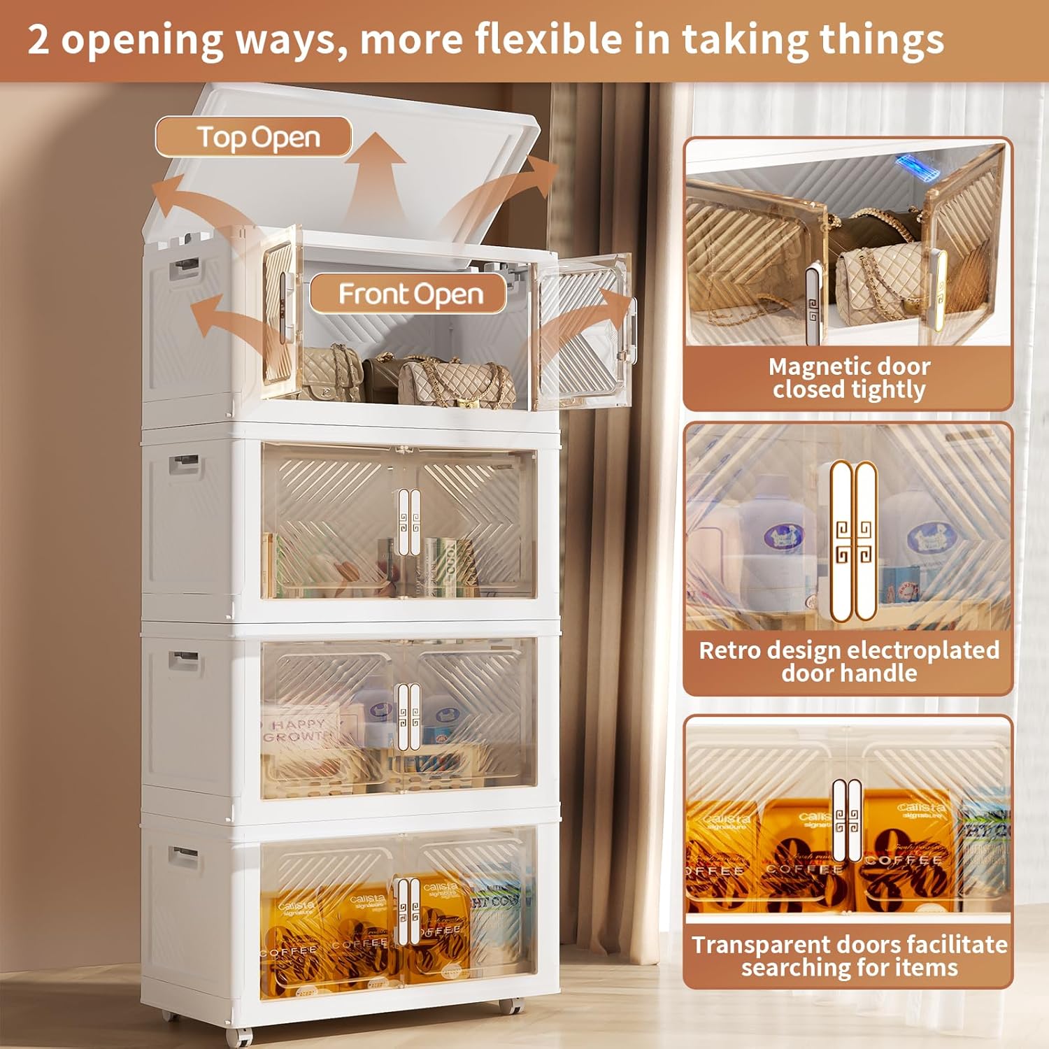 • 【Double Door & Visual Design】The storage boxes can be opened from the front doors and the top lid, 2 opening ways are convenient for retrieving items from different directions. The top lid makes it easy to quickly access large items, such as clothes and blankets. Powerful magnets are built into the front door to ensure that it will not automatically open. The door is made of transparent material, making the clear storage bins visible, so you can quickly find the items you need and save your time