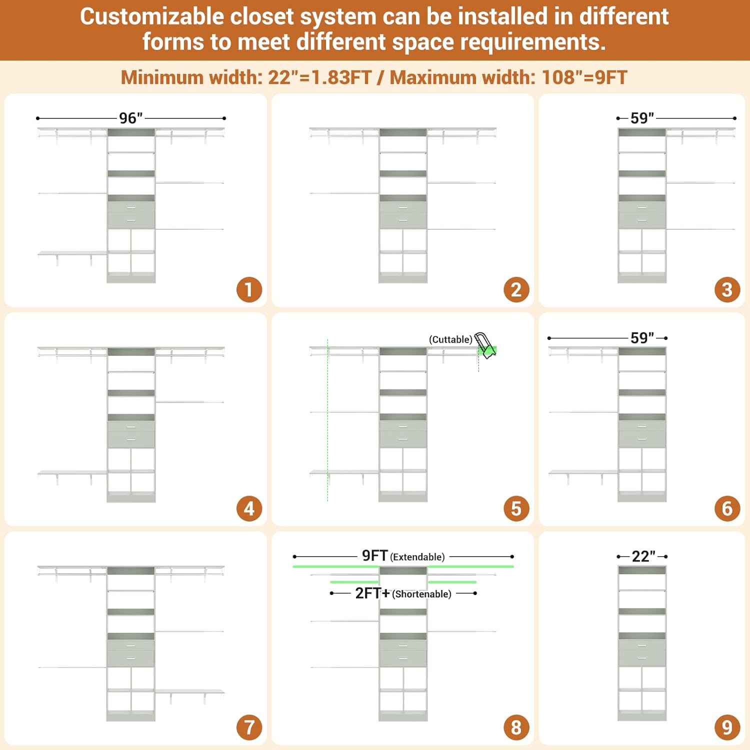• Customizable Closet System - Besiost closet system with drawers is a valuable addition to your nursery organization and walk-in closets. The small modern closet comes with additional cuttable shelves and adjustable hanging rods, designed to fit well in nurseries of varying sizes. Width: 59"–96", Height: 80"