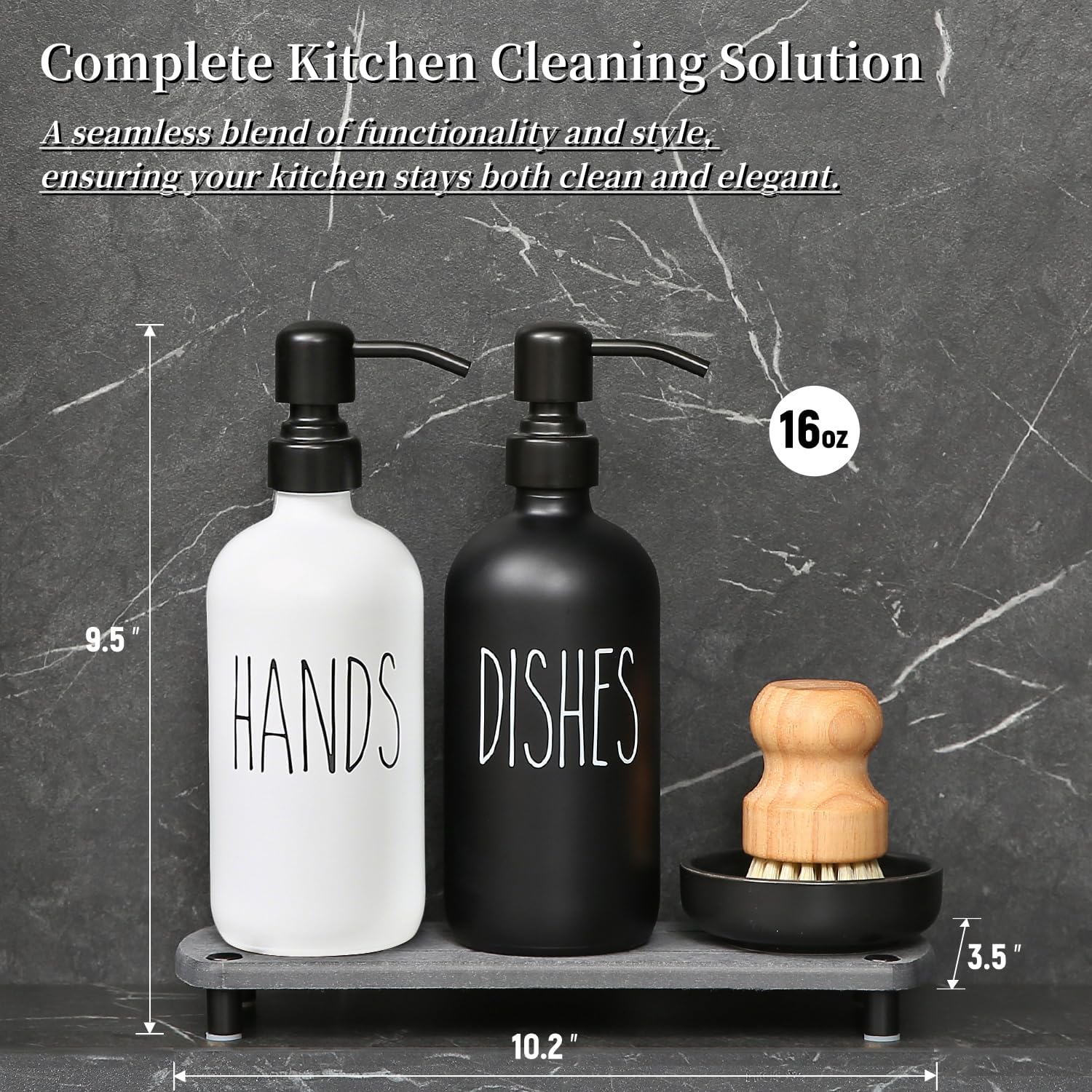 • [Complete Kitchen Cleaning Solution] This set includes one dish soap bottle, one hand soap bottle, a kitchen dish brush, and a ceramic brush holder, all neatly arranged on a stone drying tray.