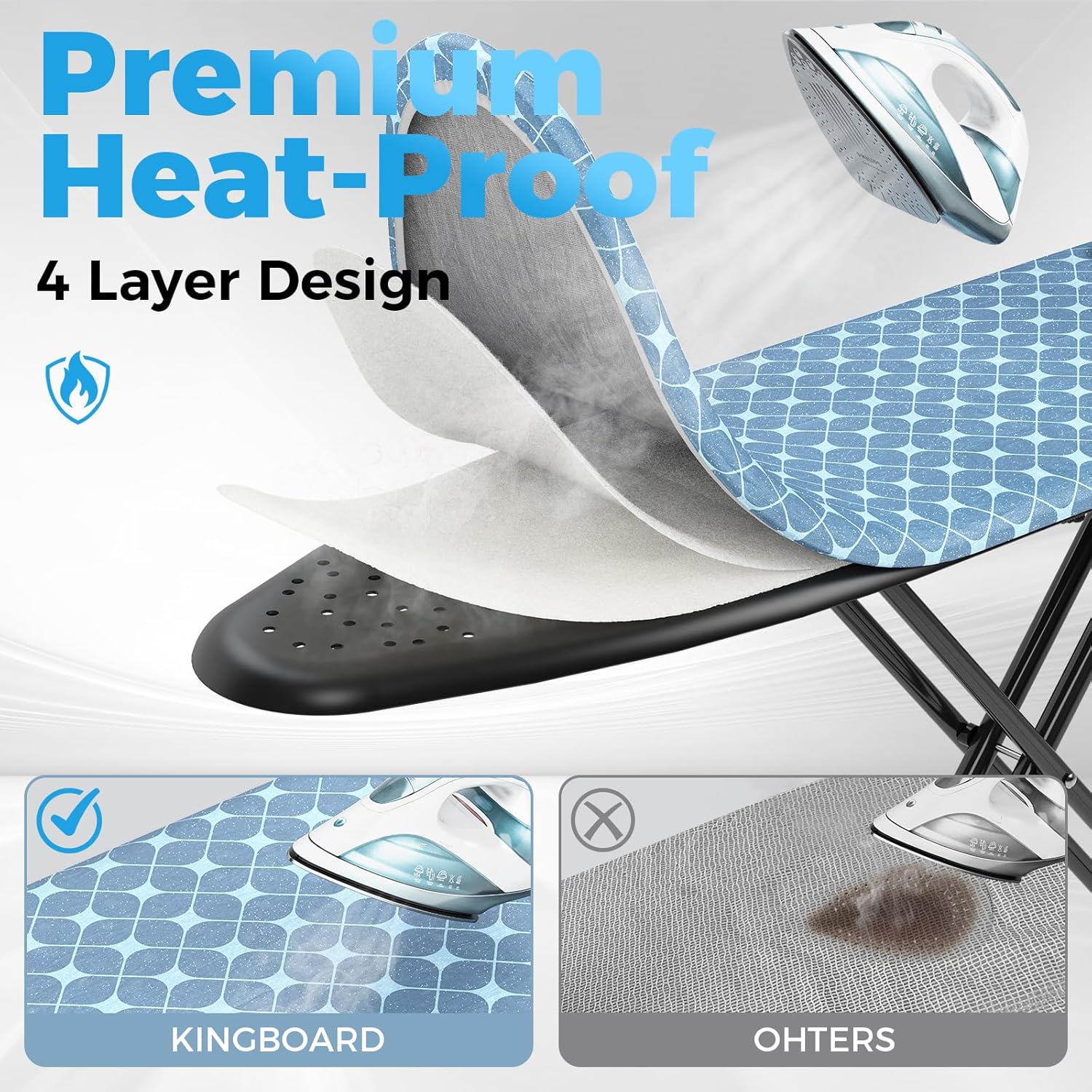 • Heat-Resistant & Washable Cover: KINGBOARD Ironing board with 5mm needle-punch cotton, 5mm sponge padding and heat-resistant fabric effectively preventing being damaged due to high temperature during ironing, ensuring long-term and stable use. Specially treated, the surface of the cloth cover has super wear resistance