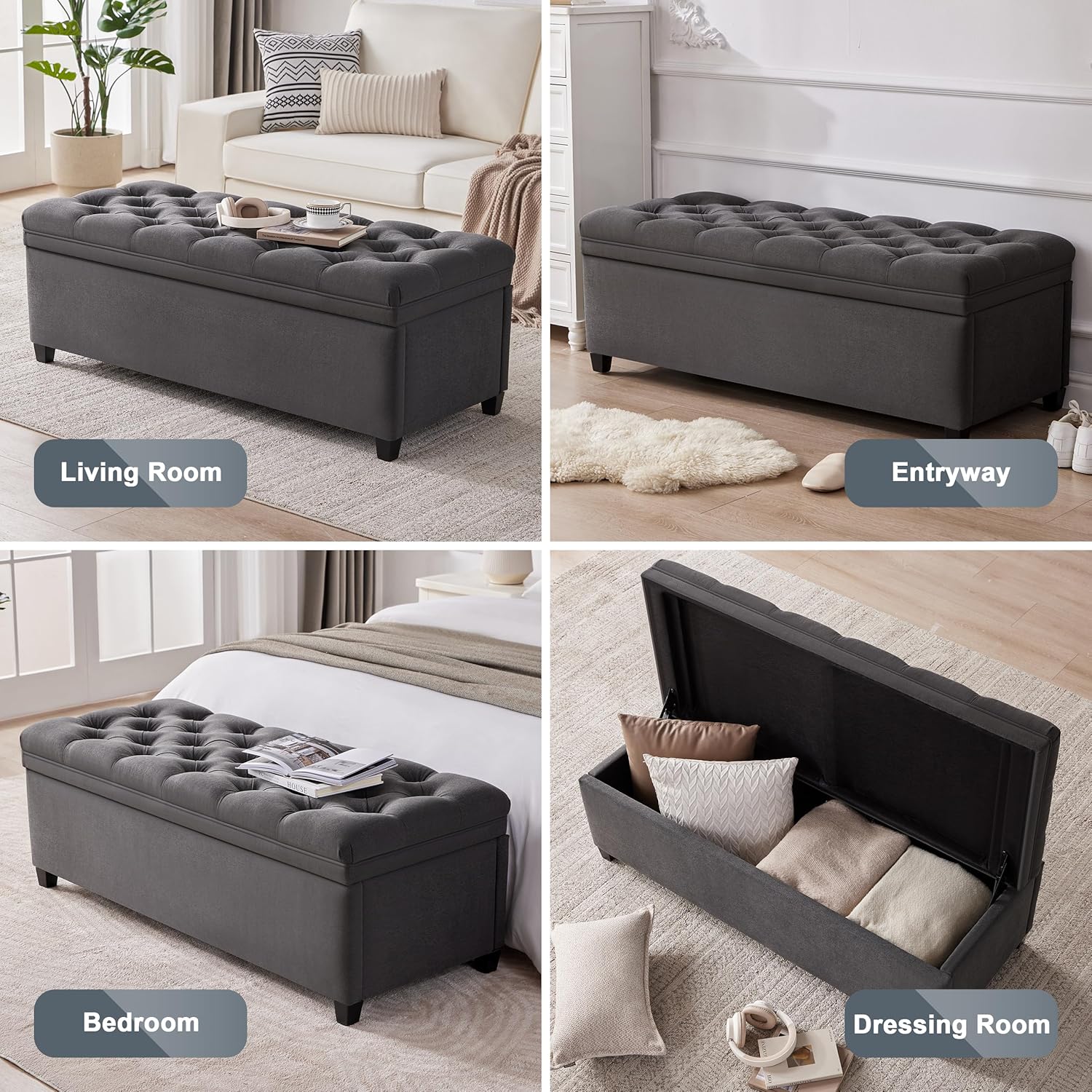 • Versatile Use Scenarios: Ideal for entryways, bedrooms, dressing rooms, or living rooms. This bedroom ottoman with storage bench works as a storage chest, shoe bench, footrest, or window seat, offering practicality and comfort for various needs