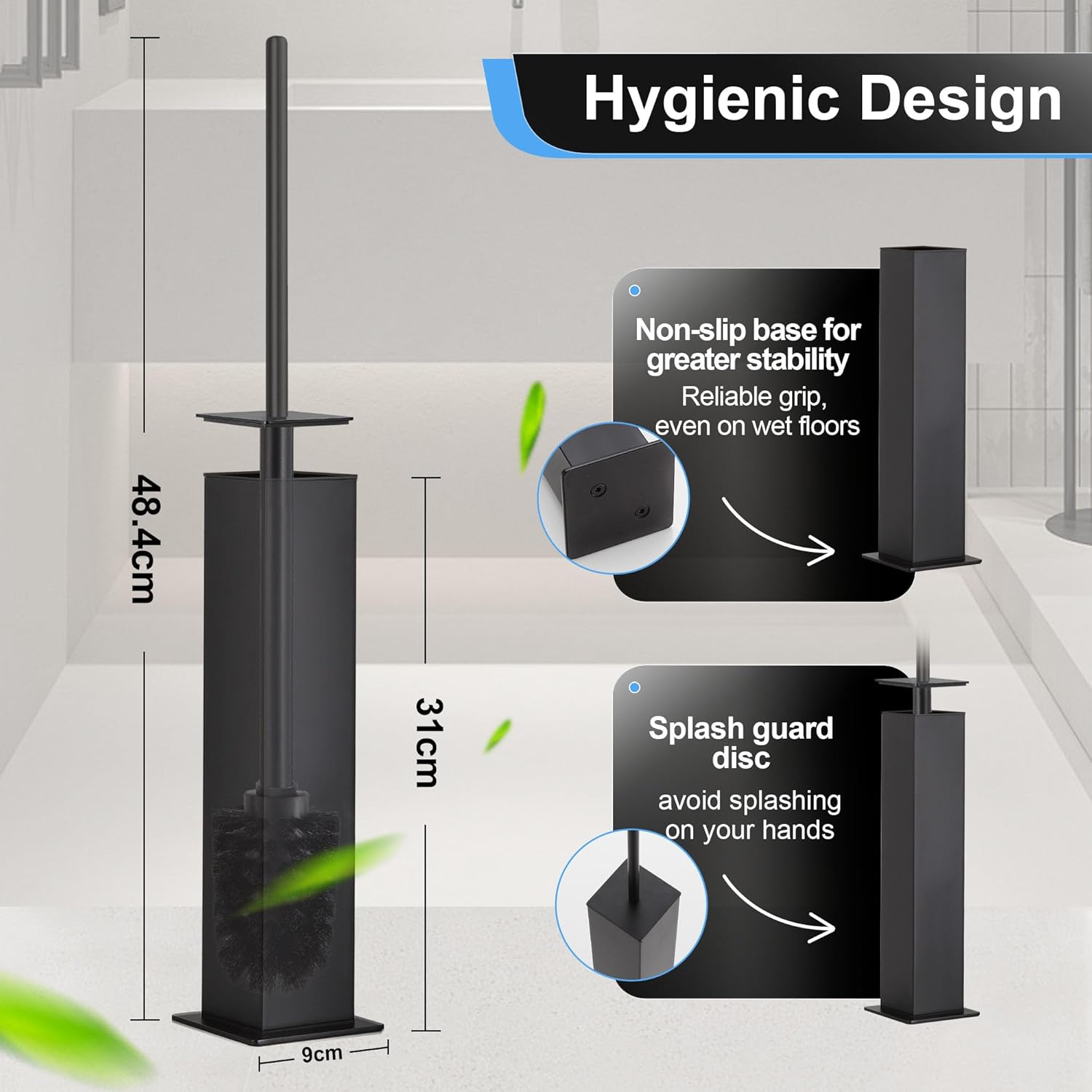 • Mid-Level Splash Guard & Integrated Hygienic Inner Cup – A splash shield at mid-handle height blocks toilet splashback, while the concealed brush holder houses a removable plastic cup that catches drips, prevents leaks, and makes cleanup quick and sanitary.