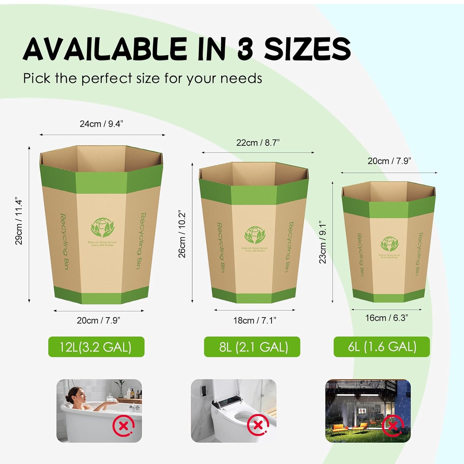 • 6-Pack Value – Choose from 3 Sizes: Each pack includes 6 recycling bins of the same size. Available in 12L (3.2 gal), 8L (2.1 gal), or 6L (1.6 gal) capacities to suit different usage needs. Compact, foldable, and easy to transport or store—these bins provide a smart and eco-conscious waste management option for any setting.